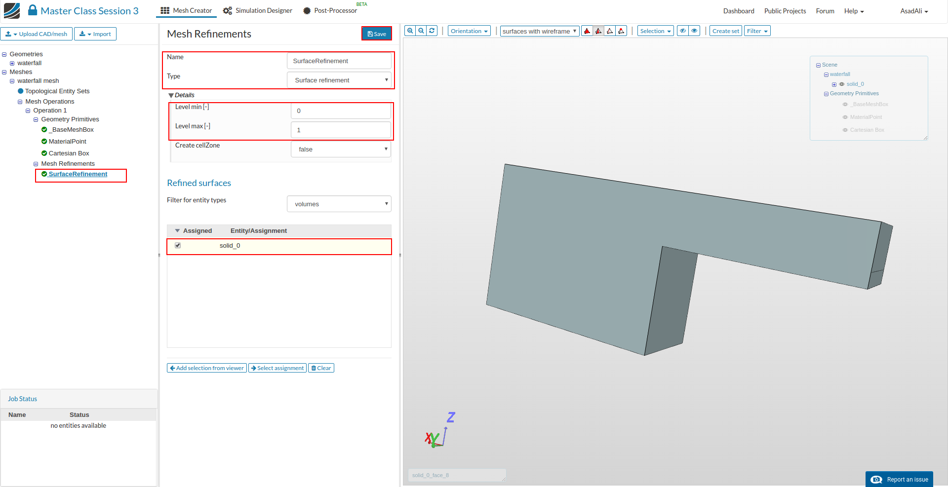 - Rename the mesh refinement to “SurfaceRefinement”, change the refinement type to Surface Refinement, set the refinement levels to 0 and 1, and then Save the selection.