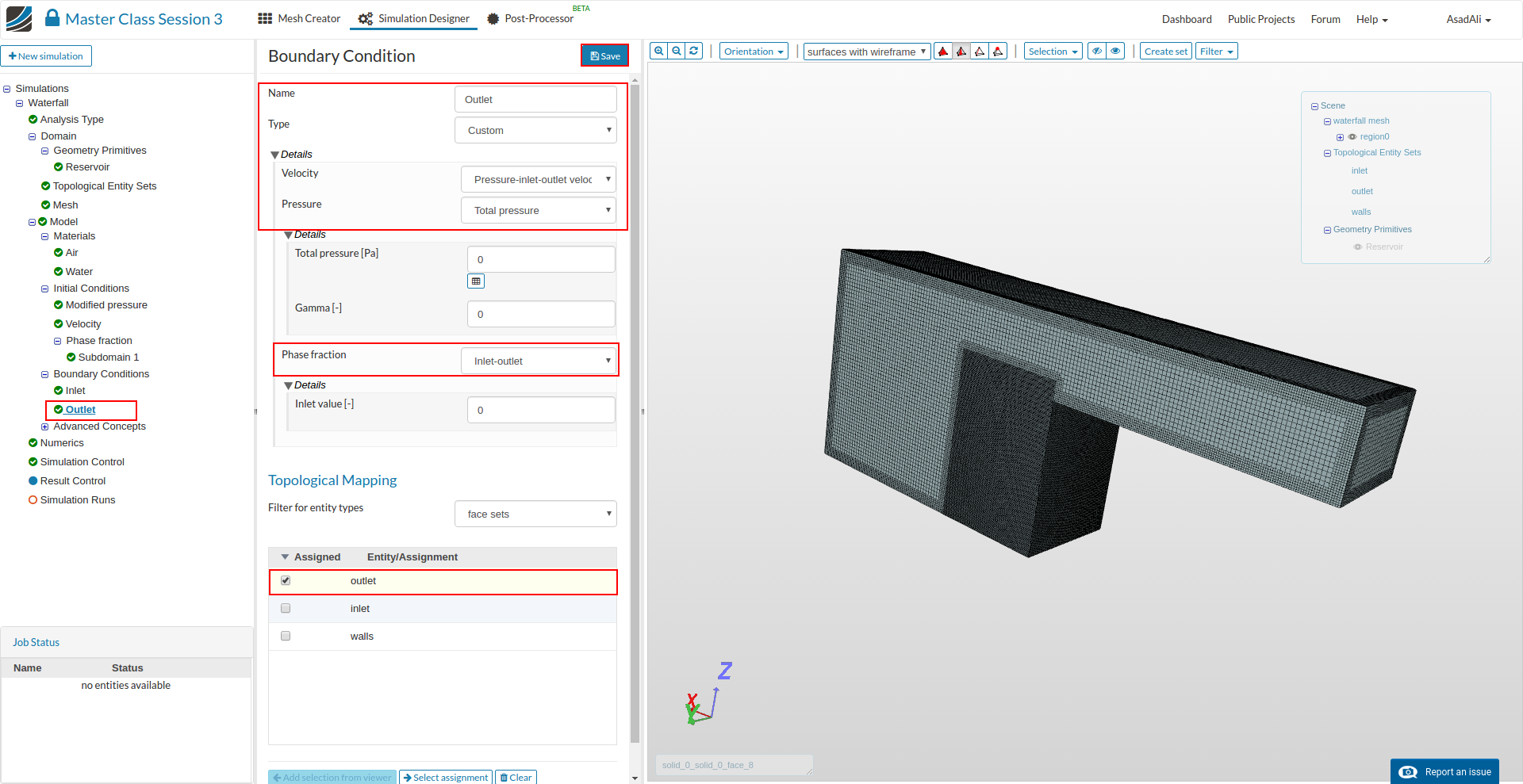 - Add another boundary condition for the outlet and rename it to “Outlet”. Set the Type to Custom with a pressure-inlet outlet velocity and Total pressure. Then set the phase fraction to Inlet-outlet and assign it to the “outlet” face. Press Save to save the selection.