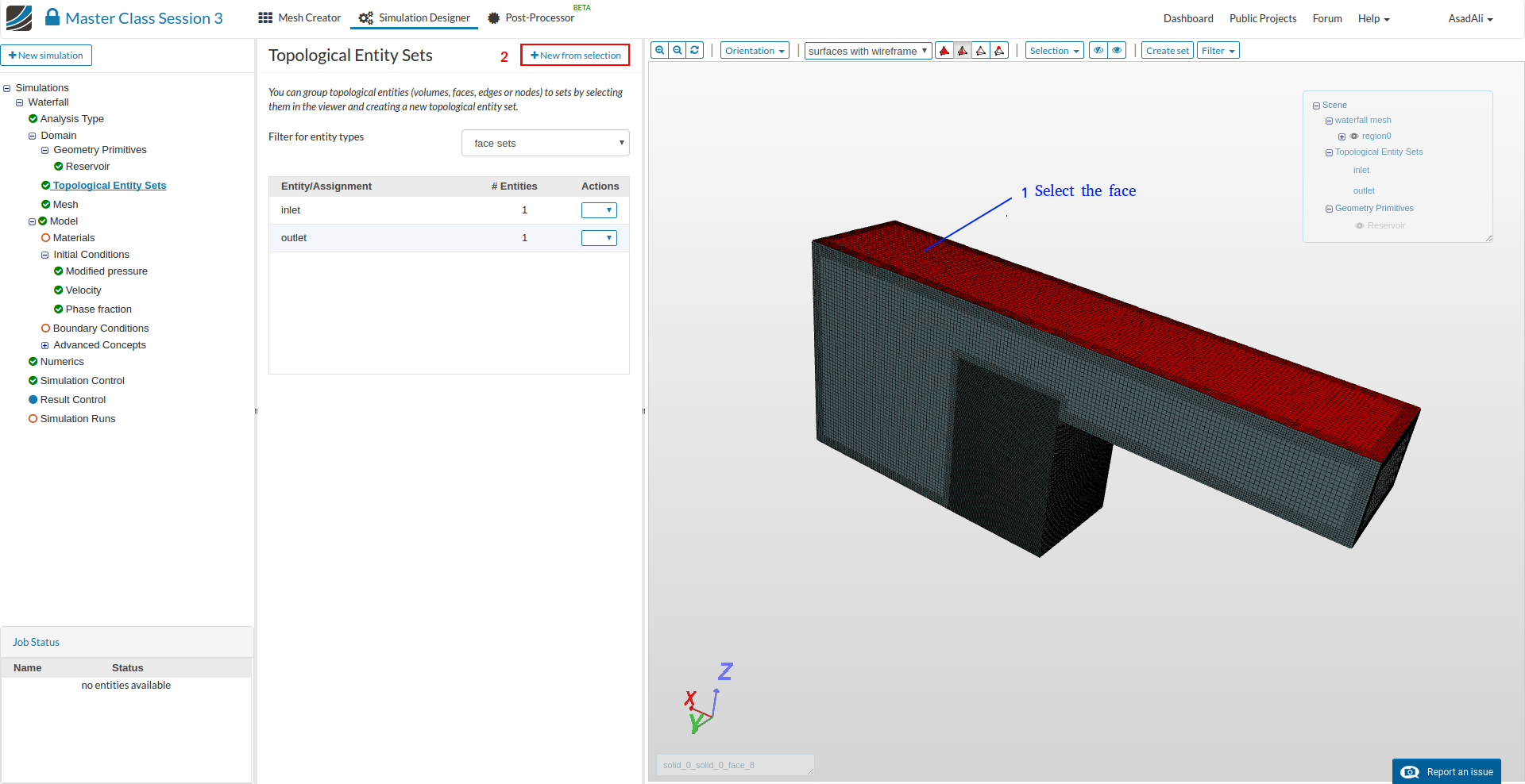 - Now move to the item called Topological Entity Sets, select the inlet face as shown in the image and press +New from selection. Rename this selection to ''inlet".