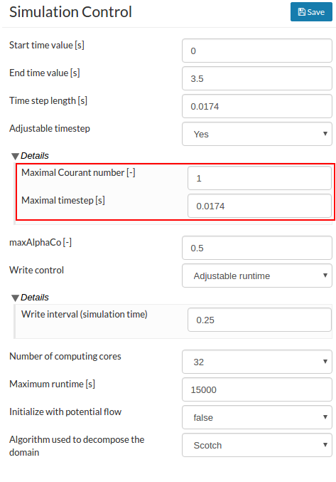 In this exercise we will examine how the Courant number affects the stability and simulation time. A high Courant number speeds up the simulation convergence but can lead to instability. For this reason, the Courant number is restricted below 1 and in some cases an even lower Courant number is required. A lower Courant number corresponds to a smaller time step size and hence more computations, but enhances stability.
