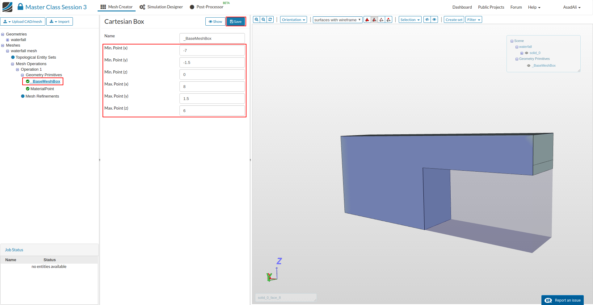 - Now move to the _BaseMeshBox in the mesh tree and set the dimensions for the bounding box as shown in the image below.