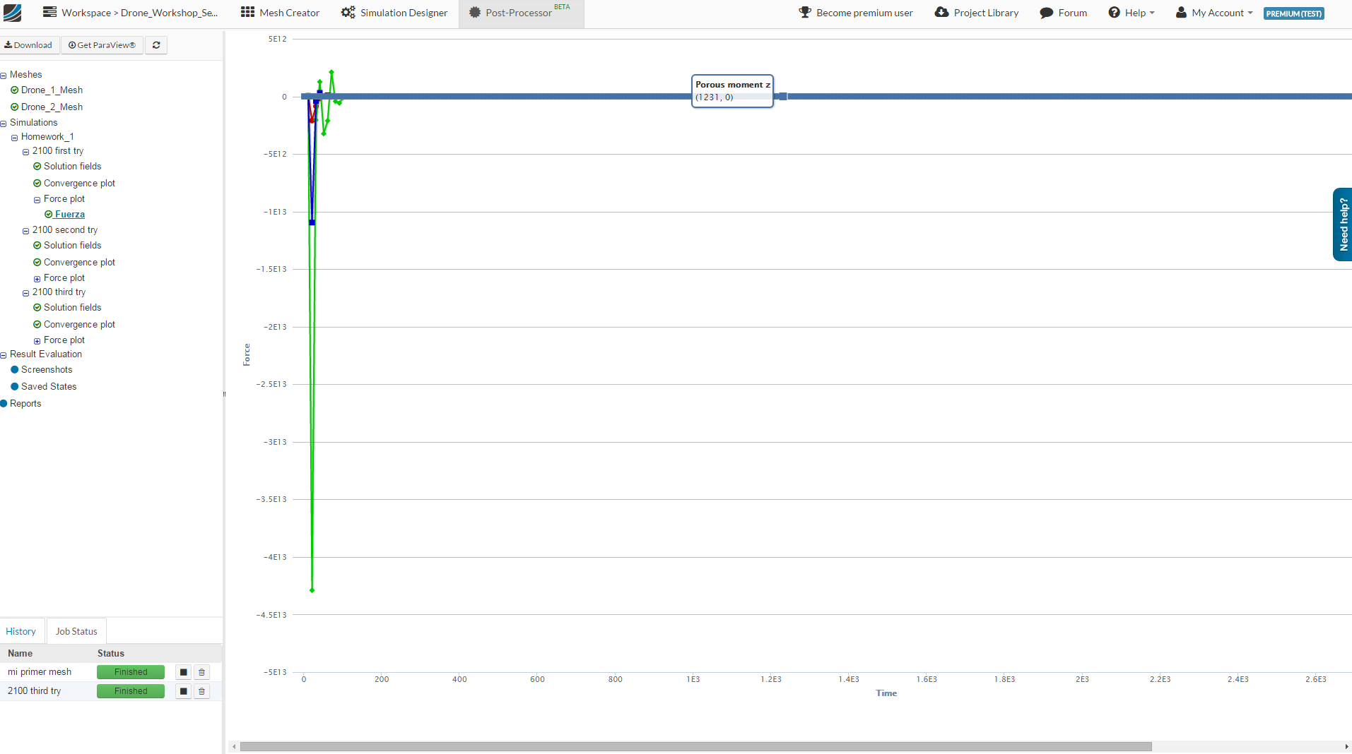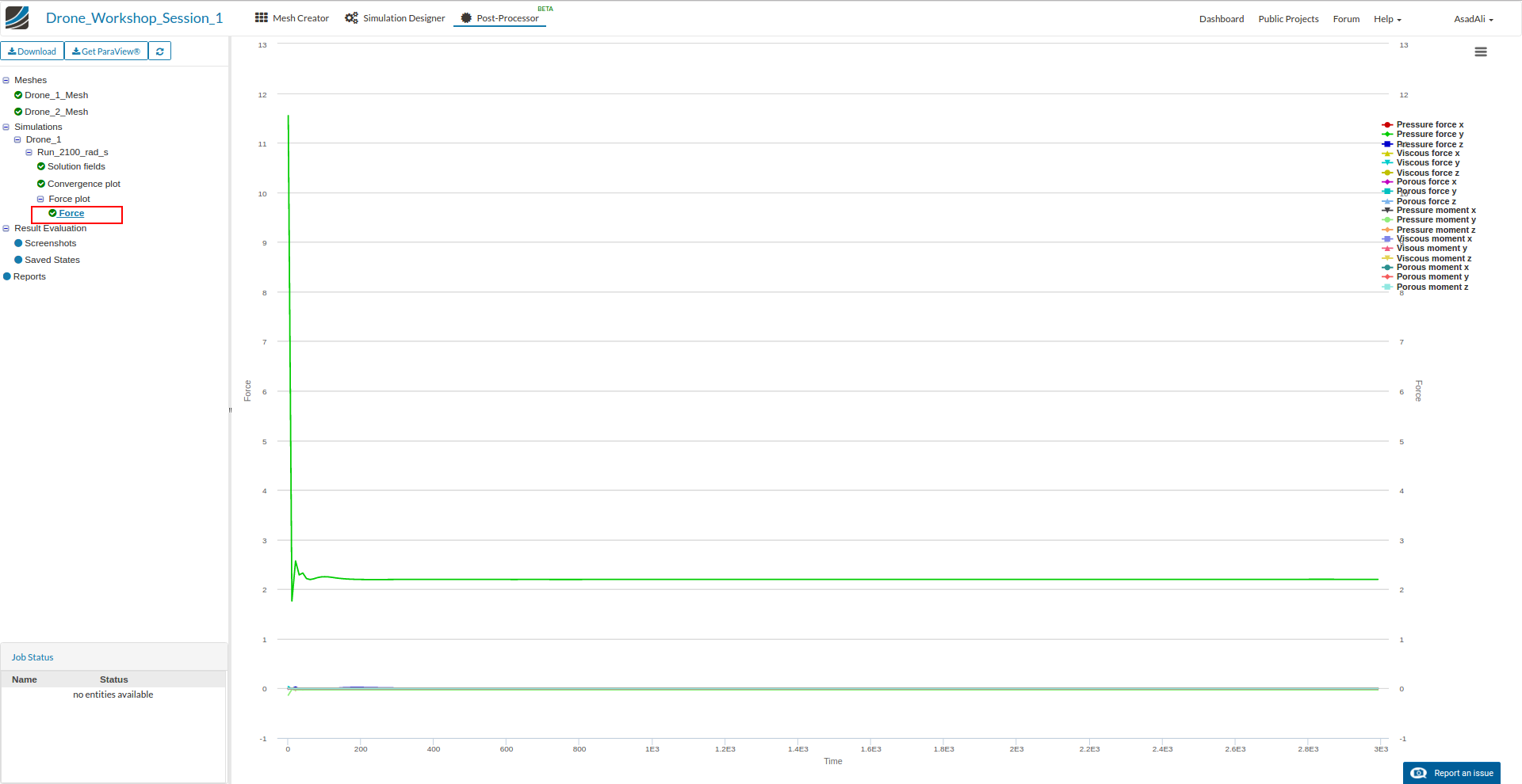Click here on the sub-item Force plot and select the related plot. This will open a graphical chart on the right side where you can see the calculated forces and moments against the number of iteration. Moving your mouse over the line for Pressure force y will show you the lift of the drone.