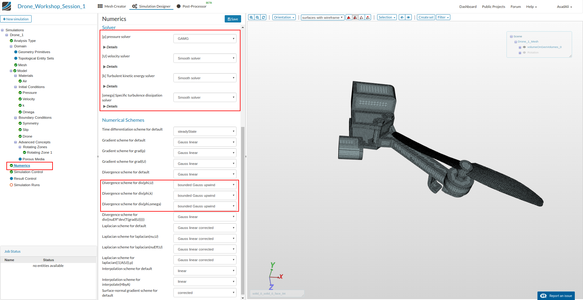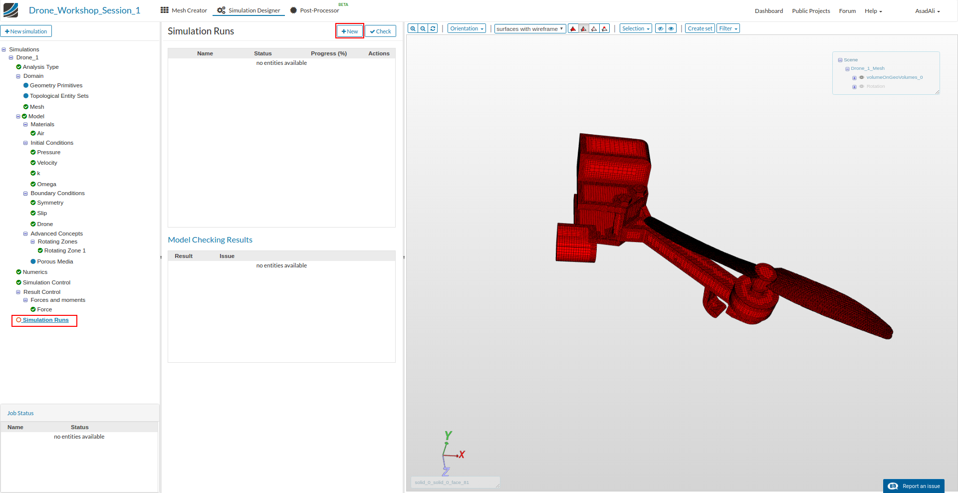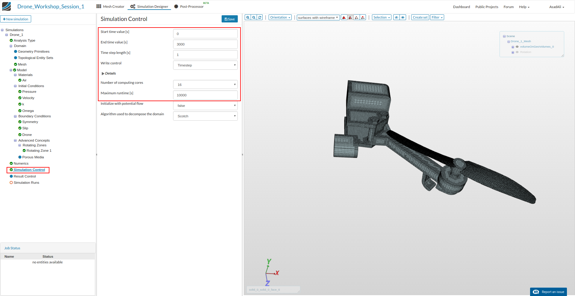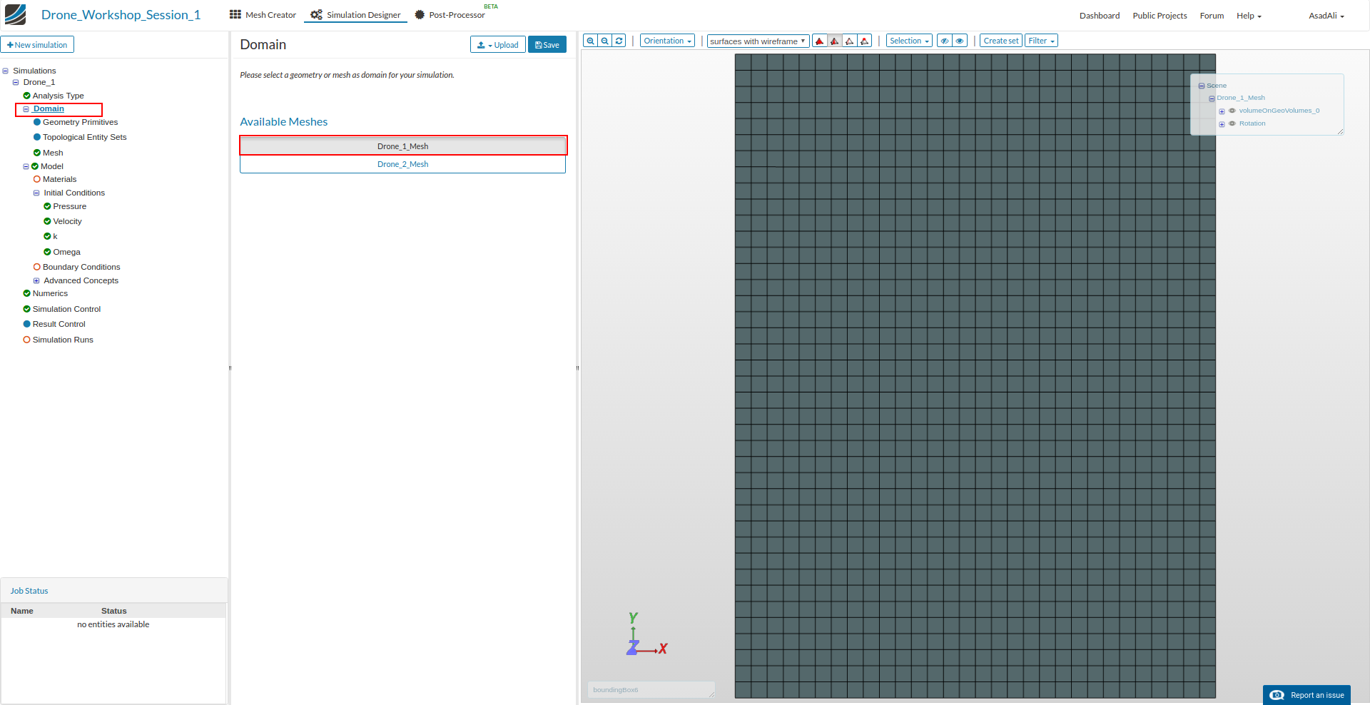Next you have to specify which mesh you want to use for your simulation. Click on Domain item in the project tree and select Drone_1_Mesh from the menu. Don’t forget to save your selection.