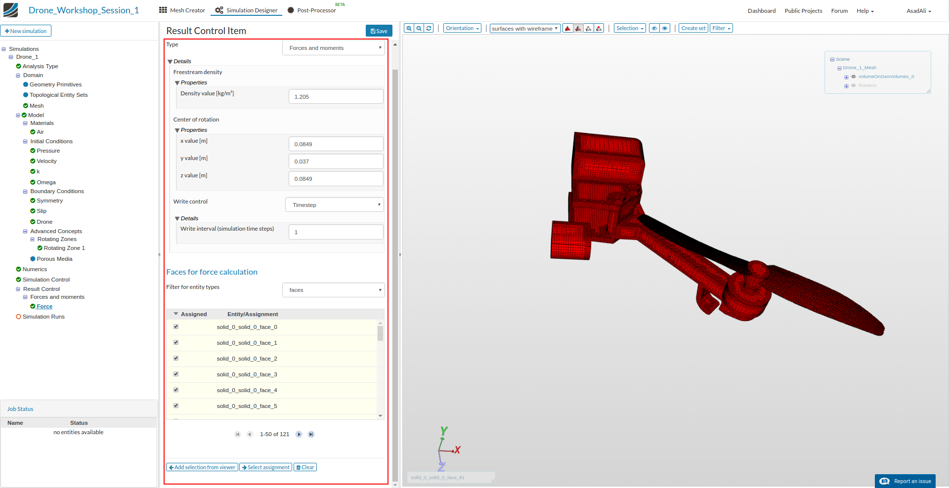 Choose Forces and moments as a type, define a Density of 1.205 kg/m³ and (0.0849, 0.037, 0.0849) as the Center of rotation. Skip the remaining settings and add all surfaces of the drone to the surface list (workflow according to the drone boundary condition)