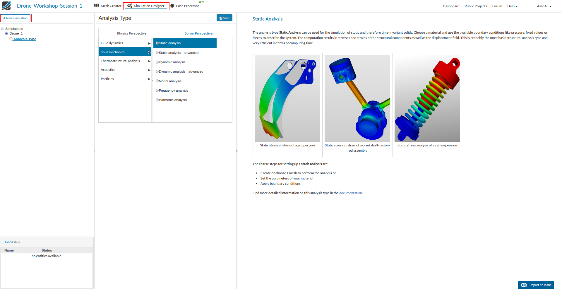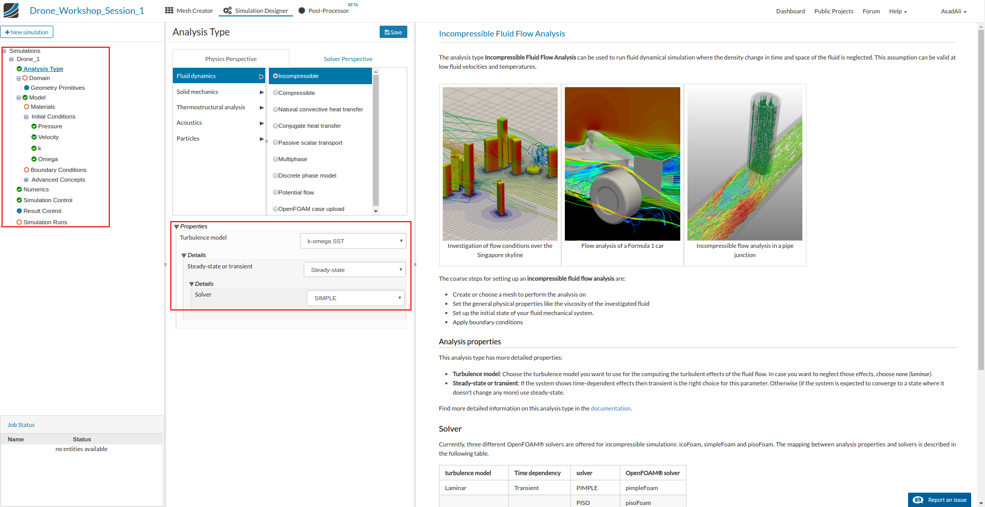 You will be notified when the project has been imported and it will be added to your Dashboard. First select the project and then click on the ‘Simulation Designer’ button on the main ribbon bar and then on the ‘New simulation’ button to create a simulation run. This will open an additional column in the middle. Here you can select which kind of simulation you want to run. In our case we will run a Fluid dynamics simulation of an incompressible fluid.