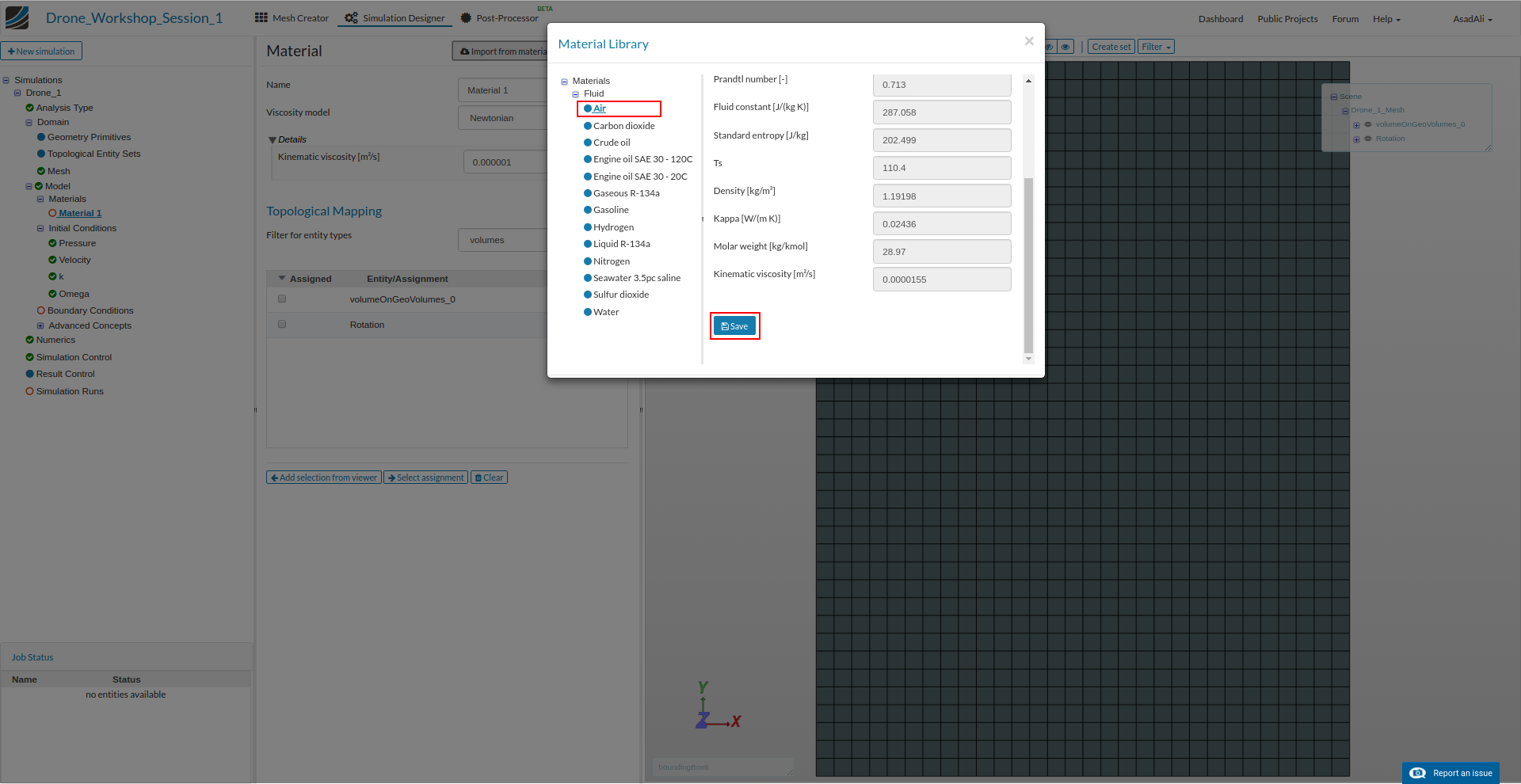 This will open a new middle column windows where you can assign fluids to your mesh. SimScale also comes with a material library which we will use. Click on the Import from material library button
