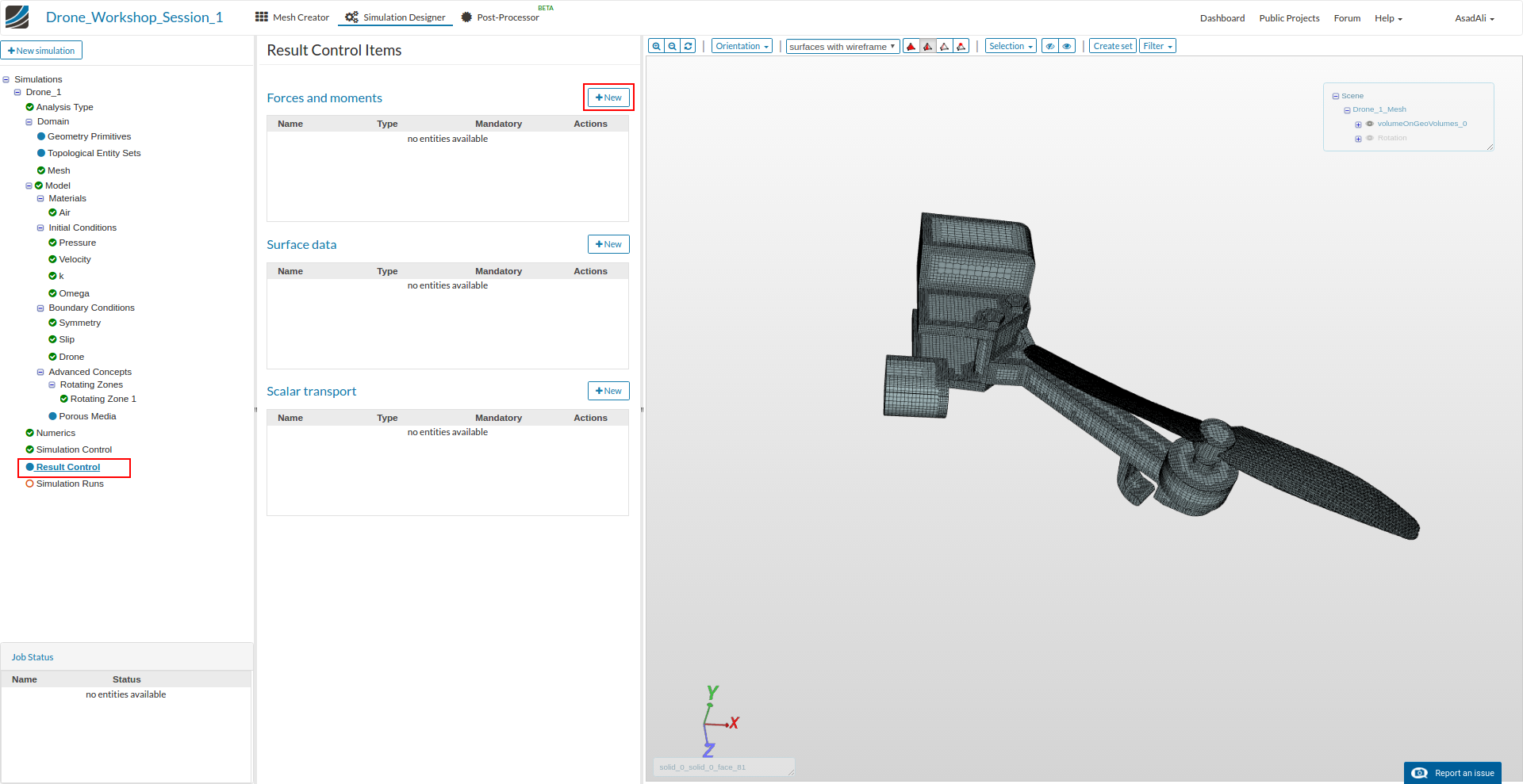 To “measure” the lift force of the drone we have to add Result Control item. Click on the corresponding item in the project tree and click on New for Add Forces and moments item.