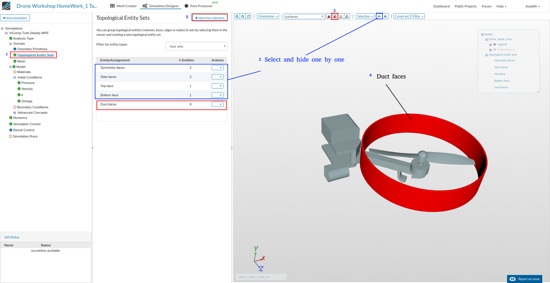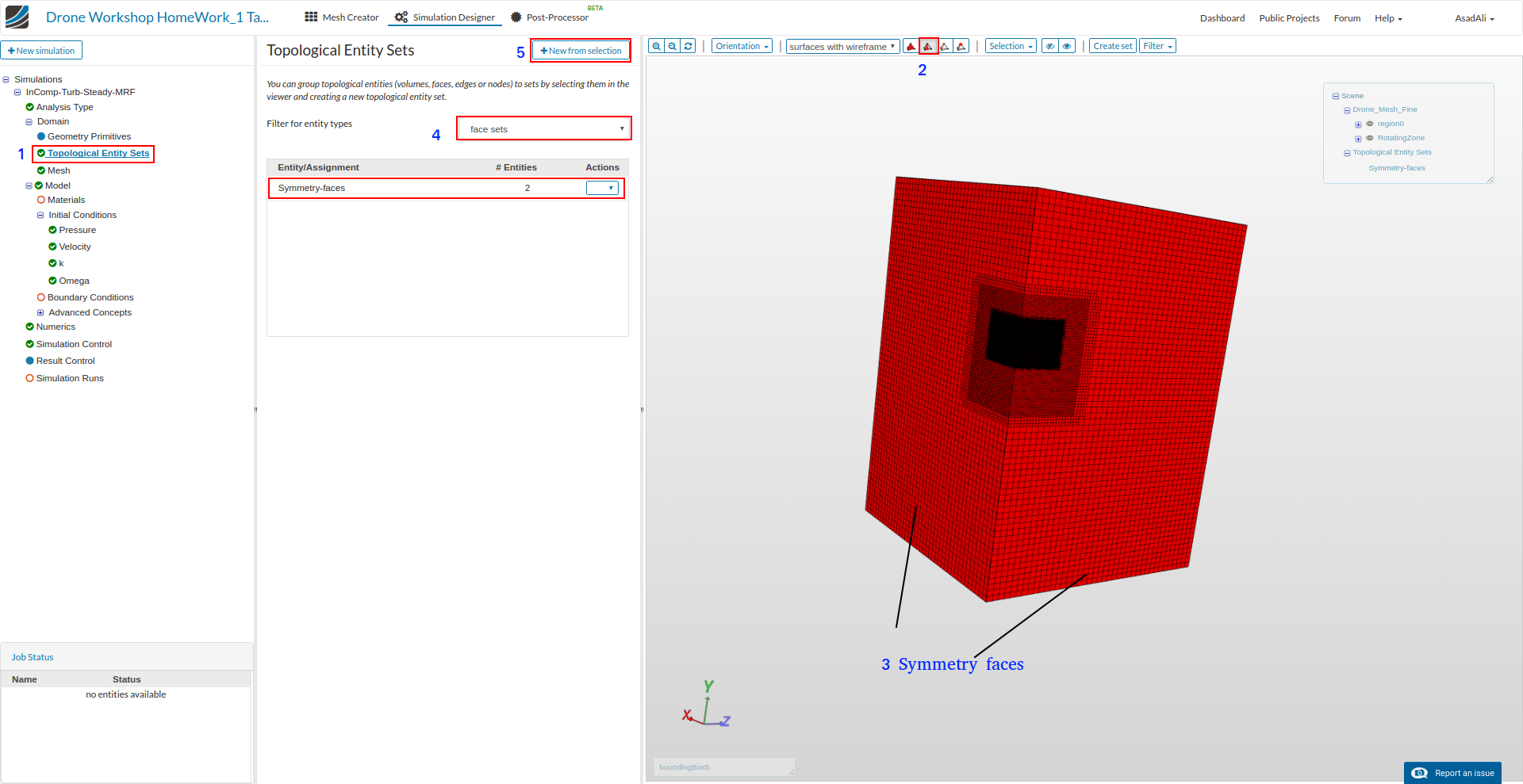 Click on pick faces icon in tool bar [2] and select the highlighted faces [3] as shown in figure below. Change filter for entity types to face sets [4] and click on Create entity sets from viewer selection [5] to create the Symmetry-faces set.