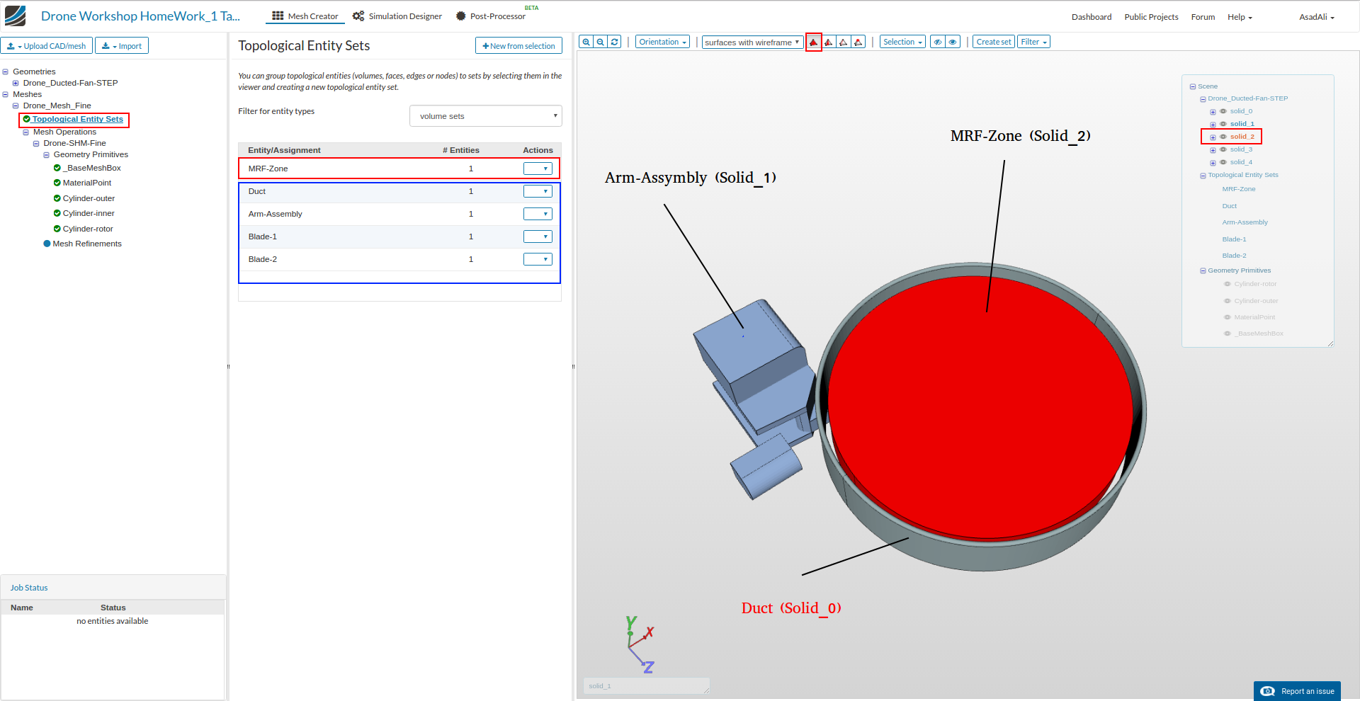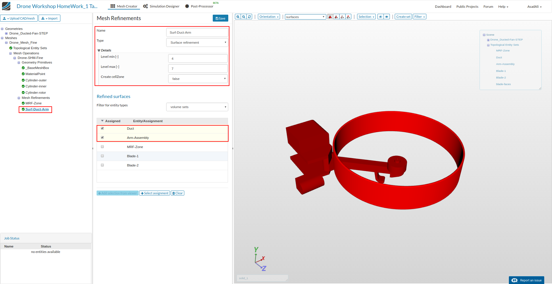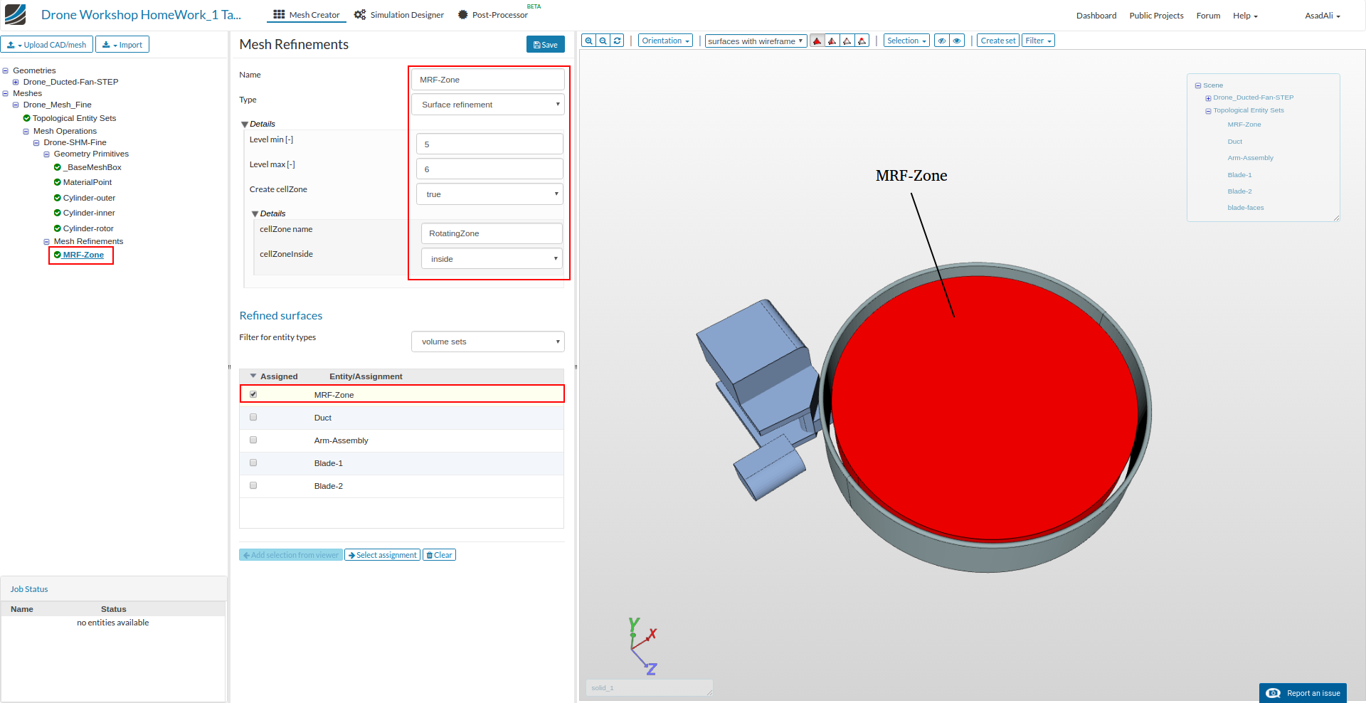 Level 2 includes the CFD analysis of the modified ducted-fan geometry for the drone. This task requires you to firstly generate the mesh with a rotating zone and then setup a simulation with Multi-Reference-Frame (MRF) and advanced boundary conditions.