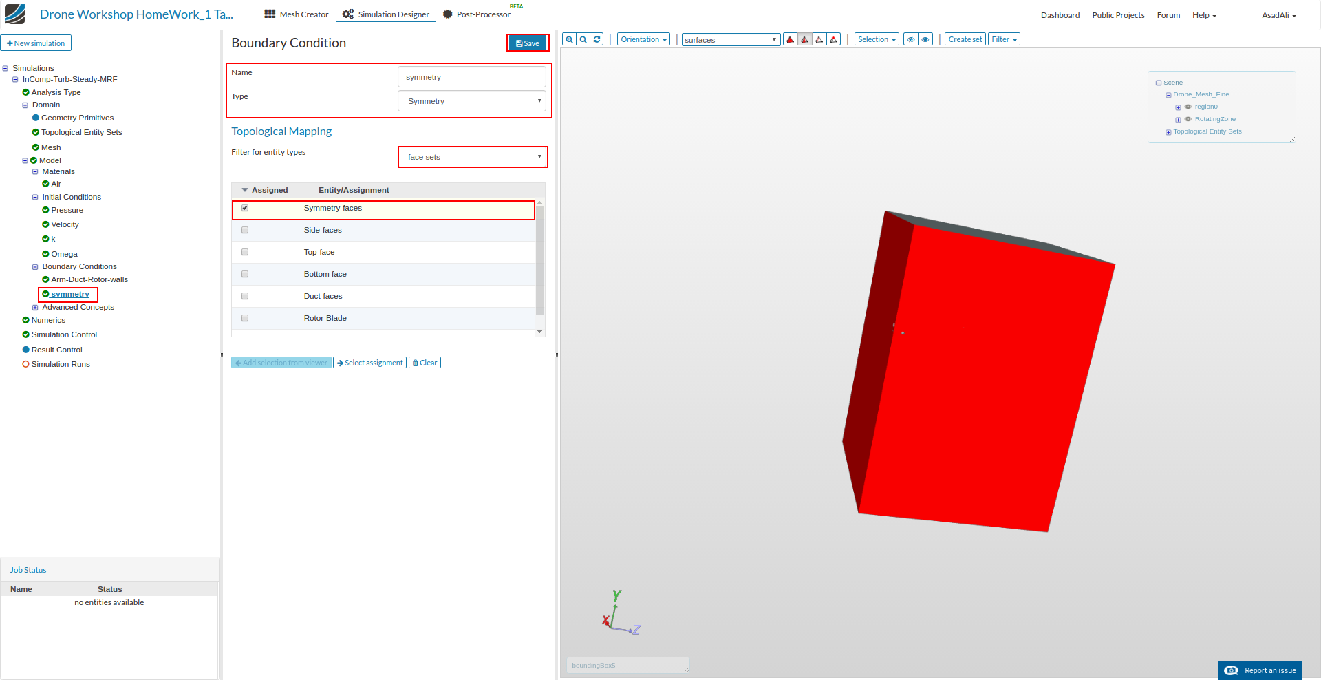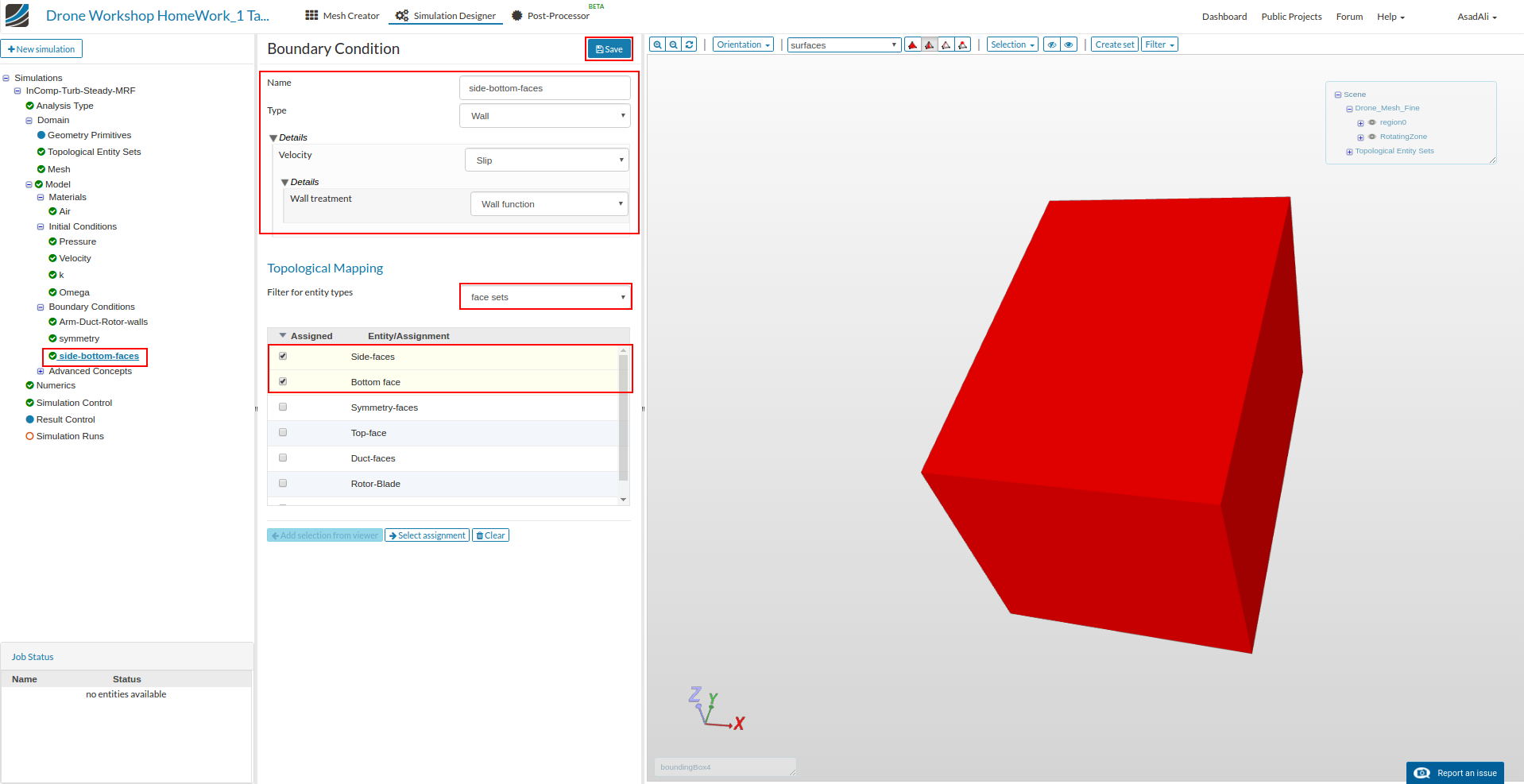 To define no-slip wall condition for the drone, enter and select the options as shown in figure below . Please note that you do NOT need to select from the viewer. Just assign by clicking the shown face set and click Save.