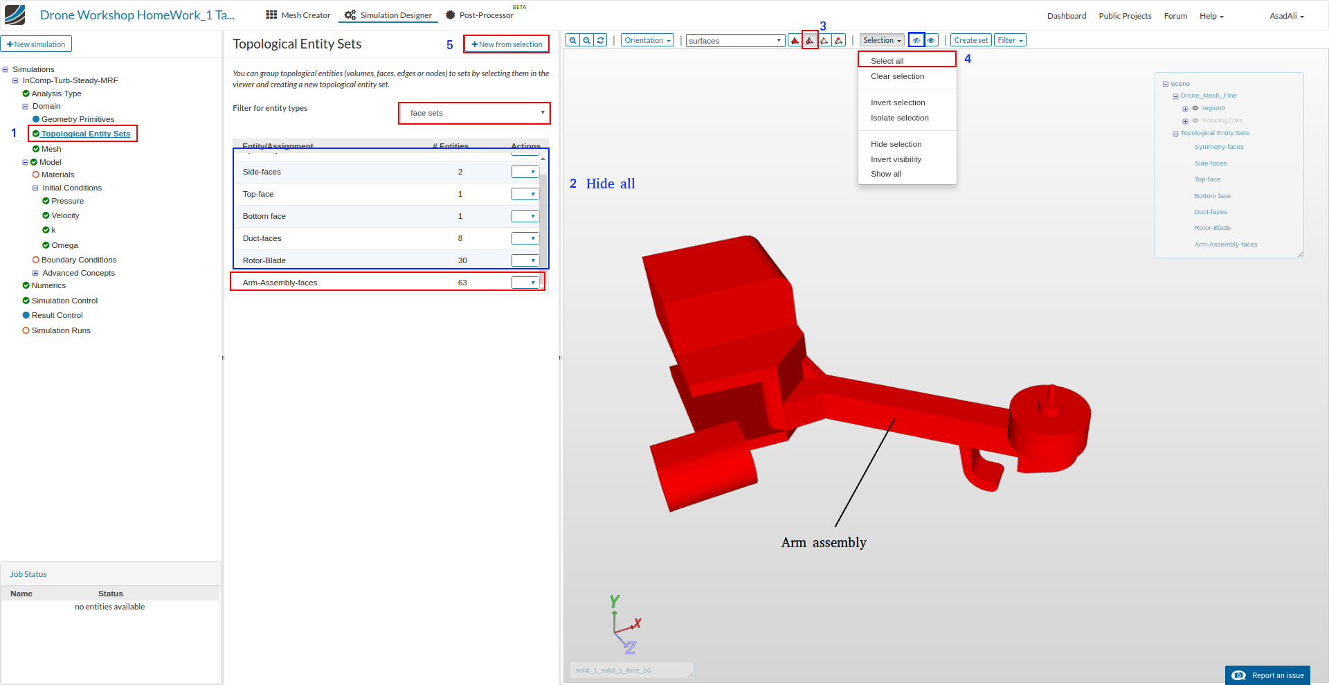 lastly, hide all created sets [2] and click pick faces from tool bar [3]. Now we see only the Arm-assembly in the viewer as shown in figure below. Click on selection in tool bar and Select all [4] to select all visible faces at once. So, create the last set called Arm-assembly-faces by clicking on create set button [5].