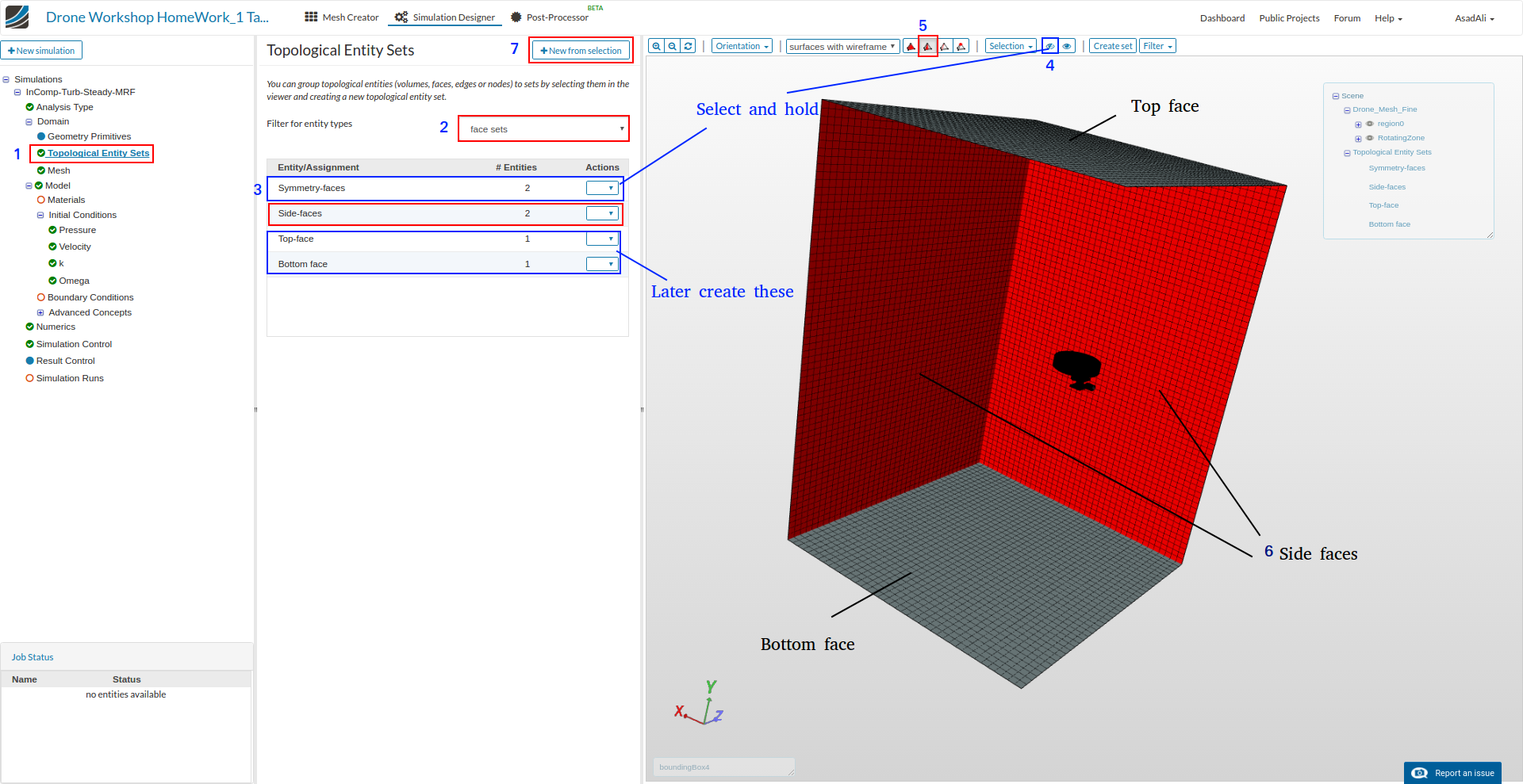 Now, we select pick faces from tool bar [5] and select the highlighted side faces as shown in figure below [6] and click on Create entity sets from viewer selection [7] to create the sets called Side-faces.