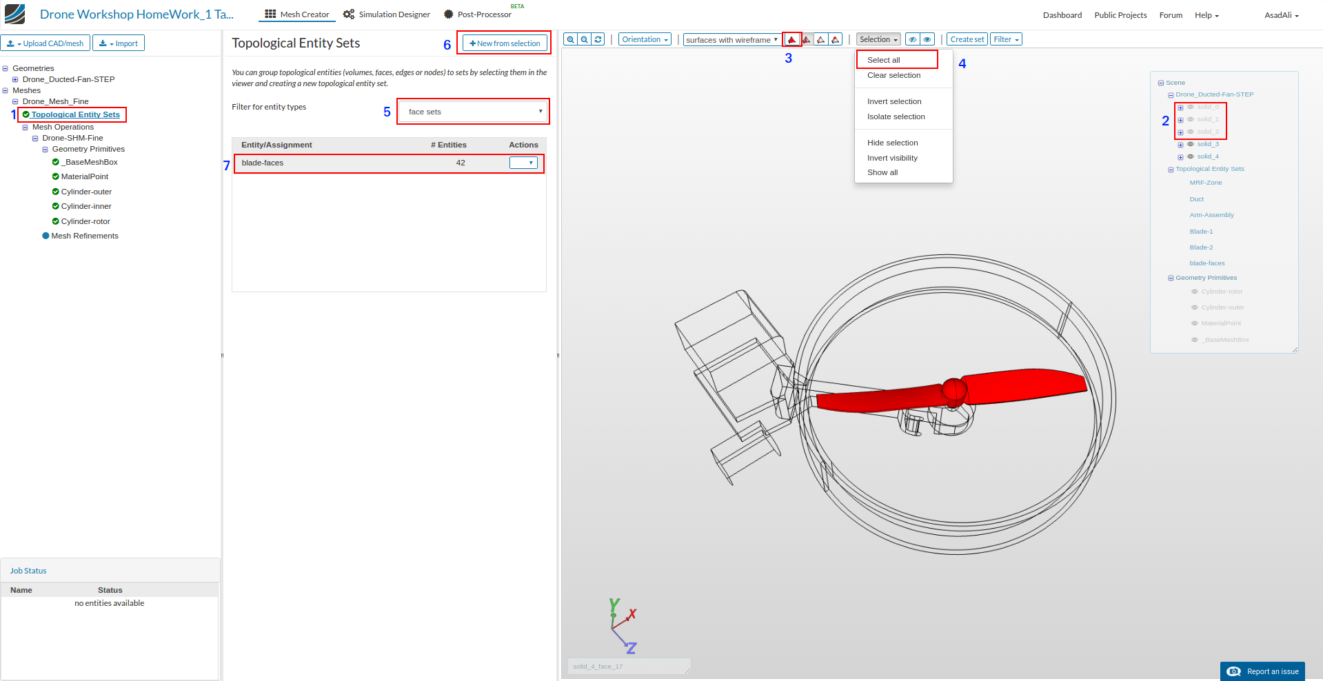 Next, from the visualization window selection tree, we will hide the Solid_0 till Solid_2 , by clicking off the eye symbols. Then, on the tool bar we click on icon pick faces, then click on selection and select all. This will select all visible faces of the rotor-blade. Lastly, click on Create entity set from viewer selection and name it blade-faces