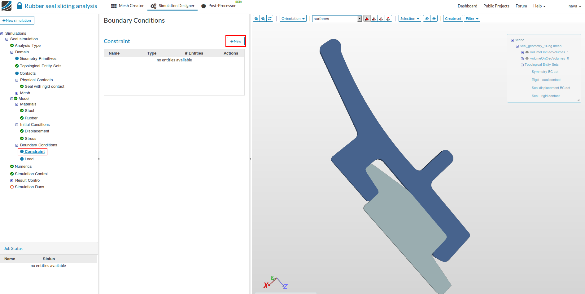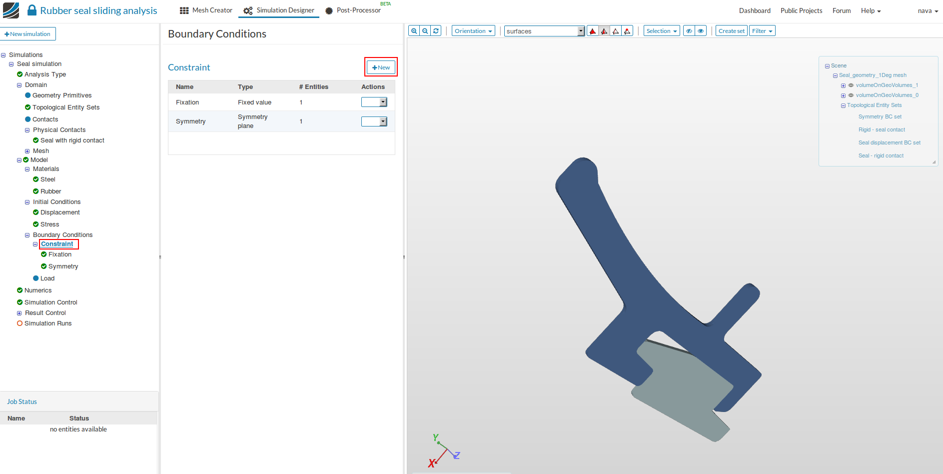 - For defining the seal displacement, select Constraint in the tree and click New.