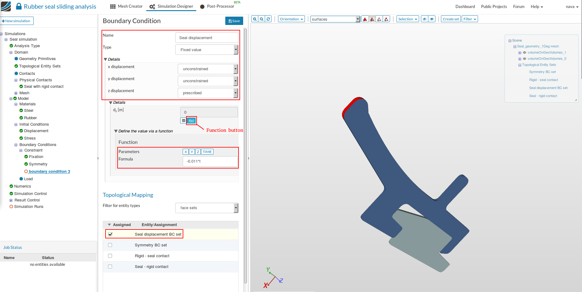 - Rename the Boundary condition to Seal displacement (optional). Choose the ‘Type’ Fixed. Choose unconstrained for x and y displacement and for the z displacement, specify it as a function by clicking on ‘function button’ and give 0.011*t in the ‘Formula’.