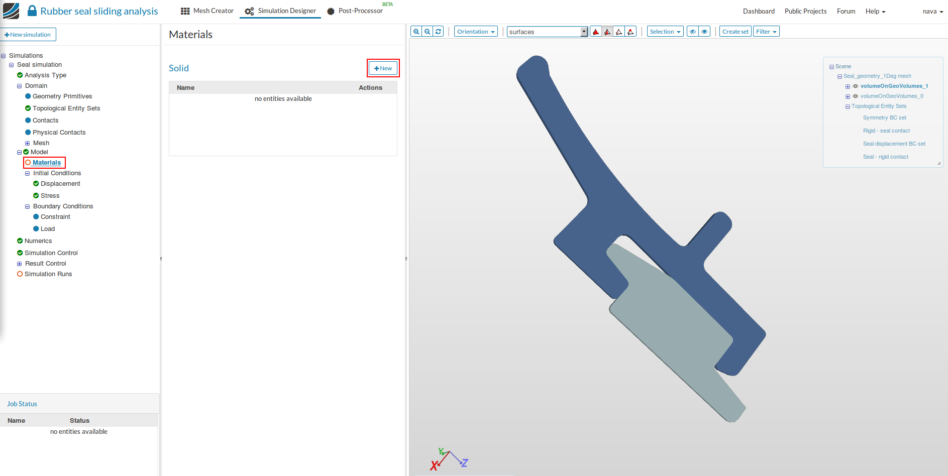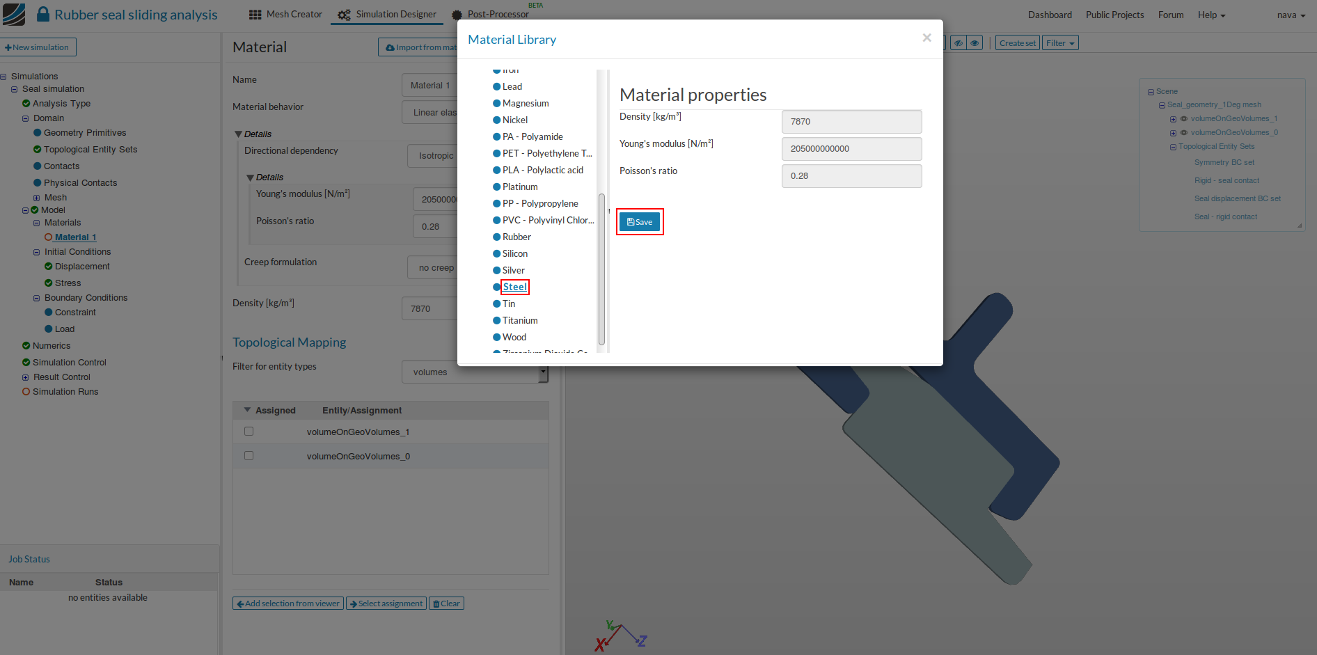 Now we will define material for our rigid body (Steel) and seal (Rubber). Select Material from the sub-tree and click New.