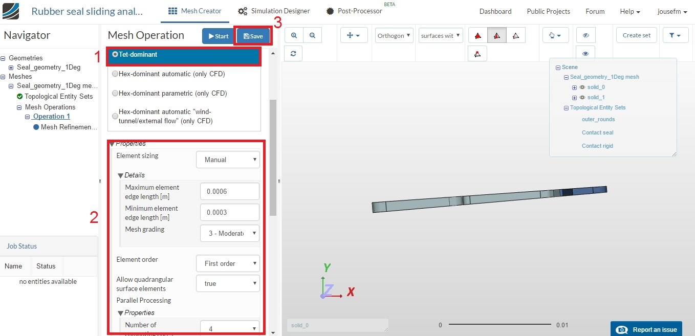 Select Tet-dominant [1] for the mesh and use the following parameters [2] - 0.0006 and 0.0003 as maximum and minimum mesh edge length respectively, First order for the desired mesh order, 3-Moderate fineness and 4 computing cores.