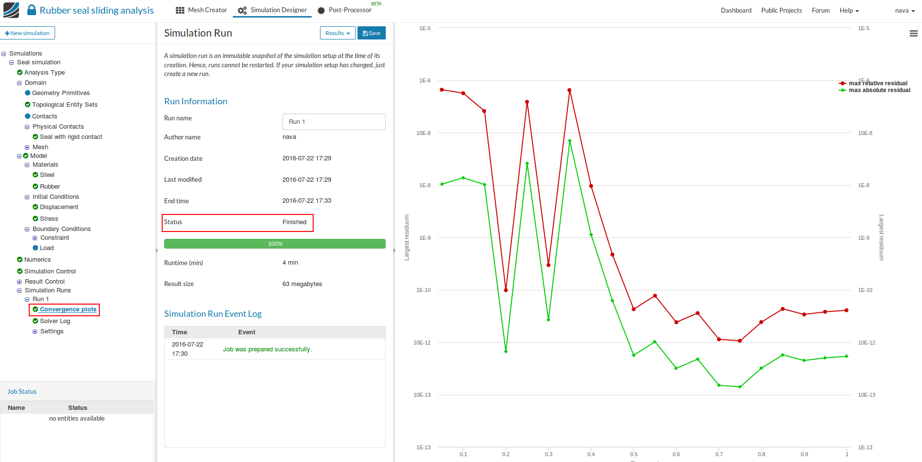 - The run takes approximately 4min. After the run is finished you can see the ‘Status’ as Finshed and the convergence plot can be seen by selecting Convergence plots.