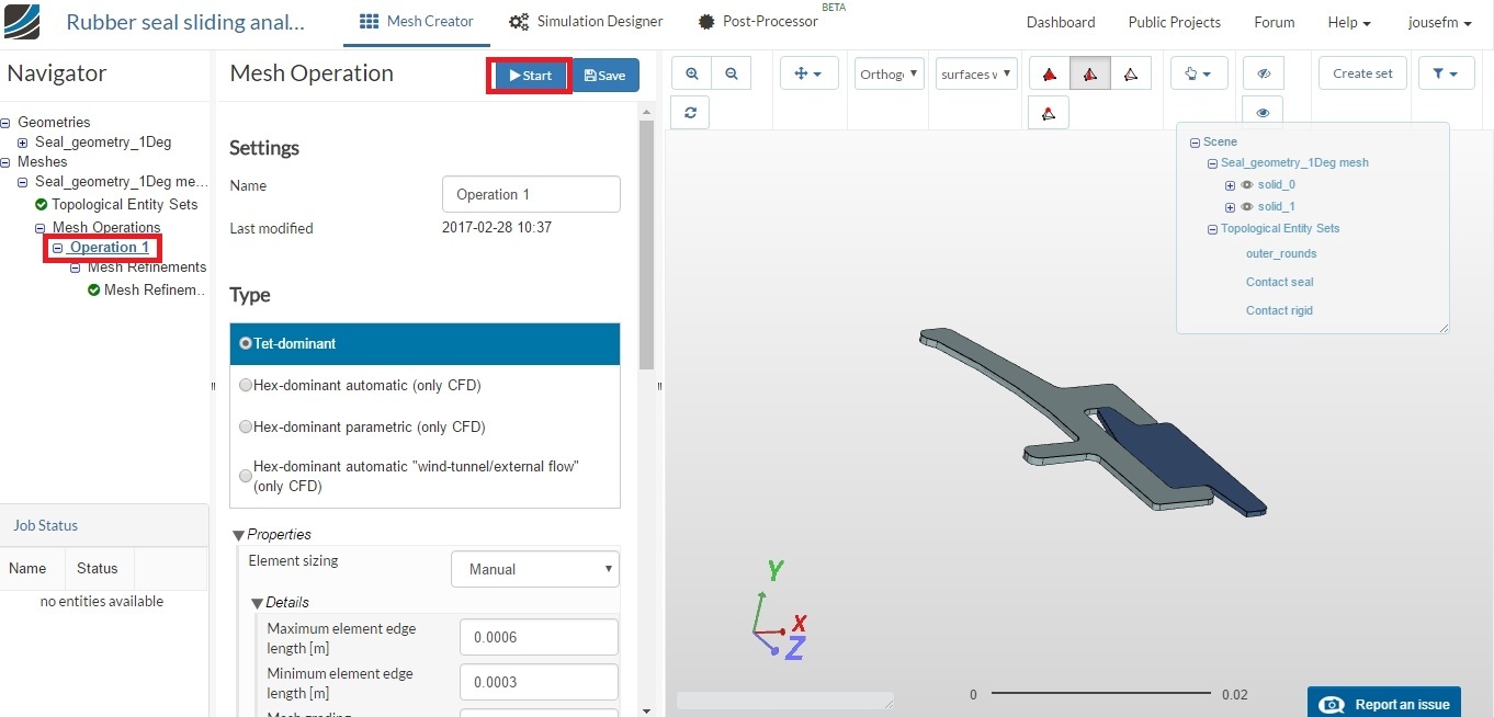 - Go back to Operation 1 and then click on Start button to start the meshing operation. The meshing job will start in a few moments and all computation is done via cloud computing.