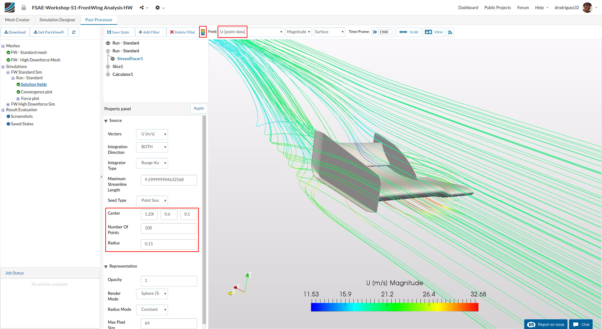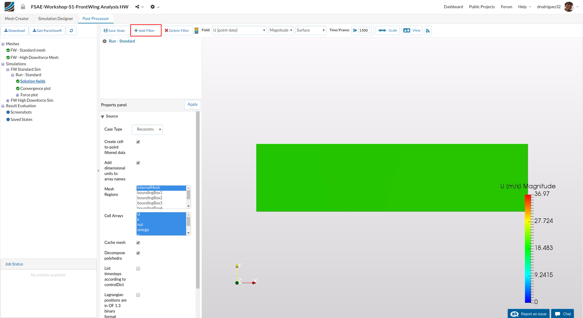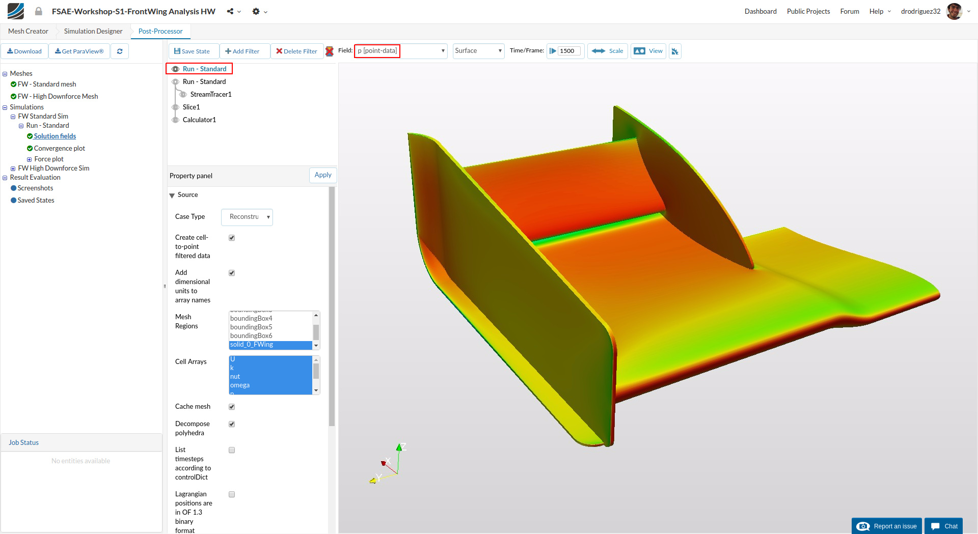 Now click on the “Run-Standard” that corresponds to the wing, and for Field select p [point-data]. This will show you the pressure distribution on the surface of the wing so you can see where the most downforce is being generated.