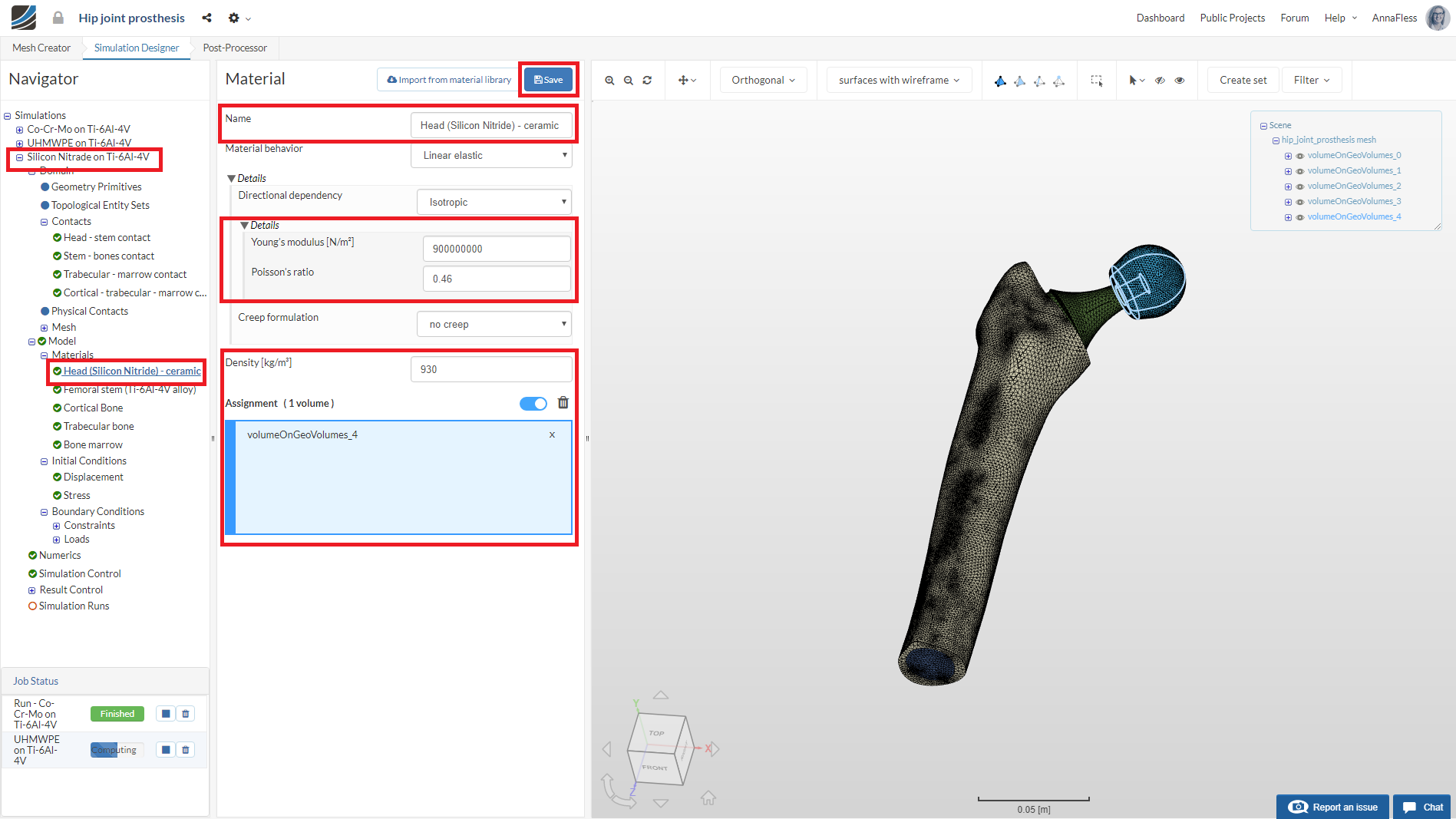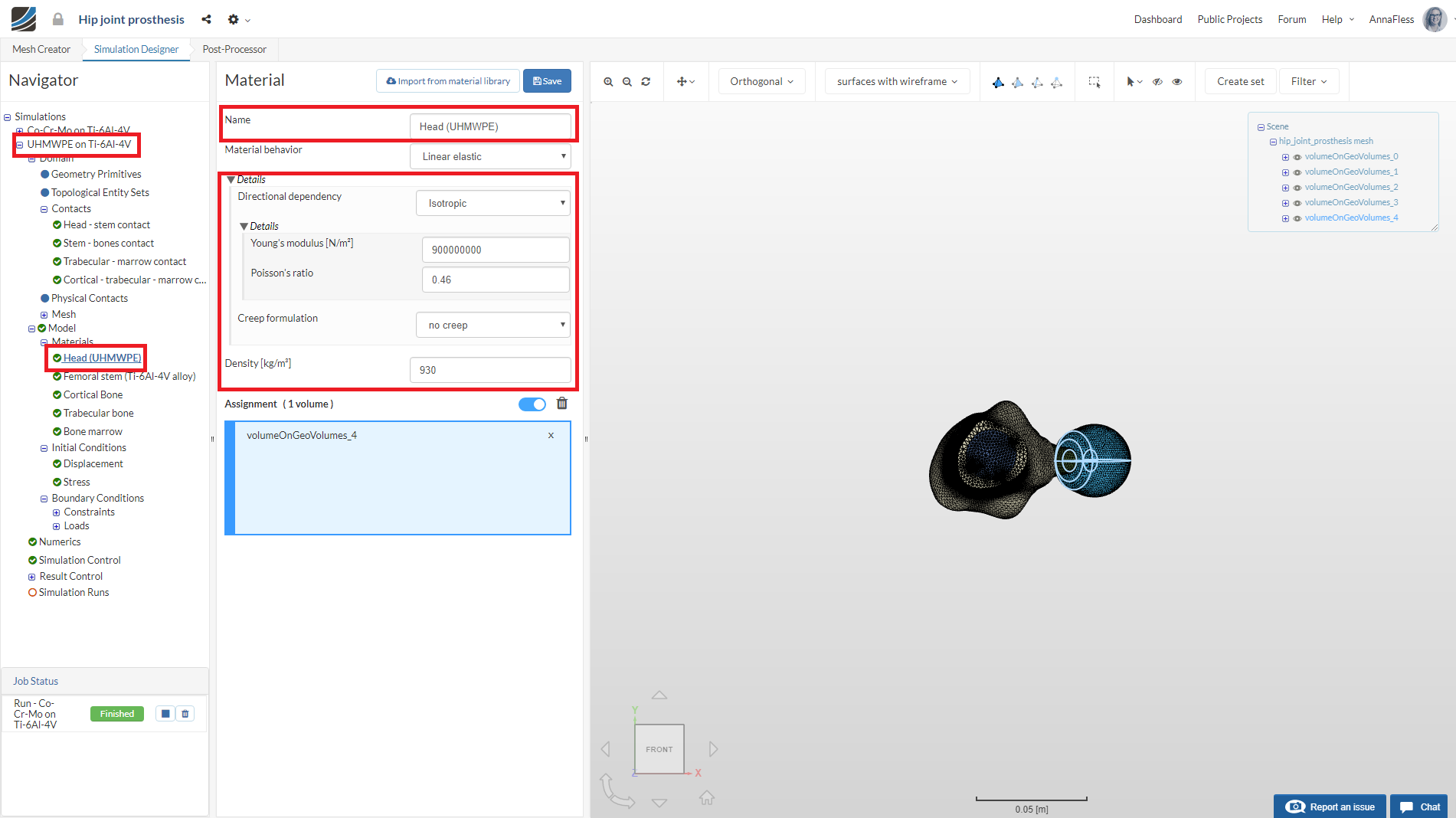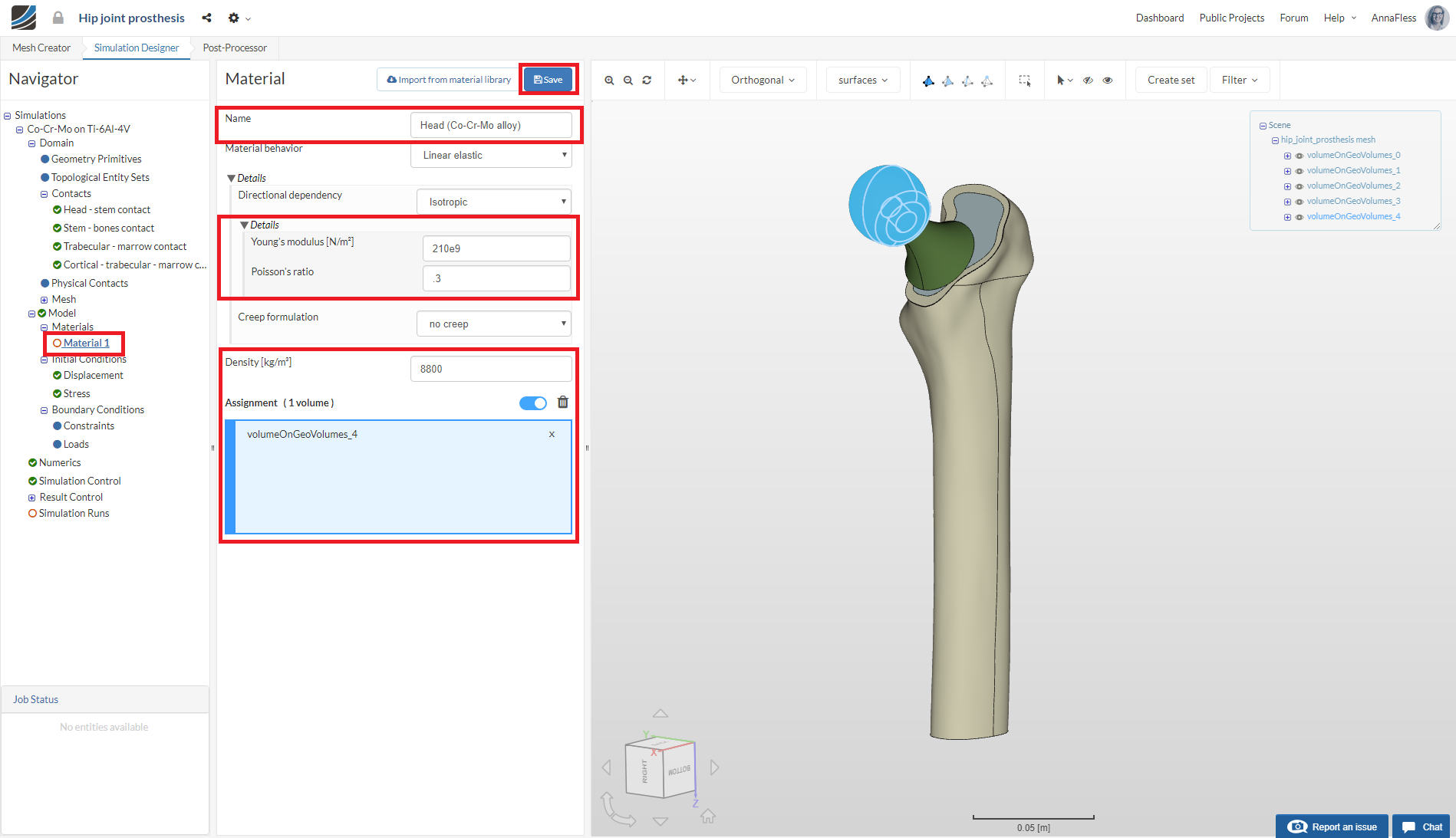 First we will define the material for the hip joint head. Rename the newly created material to Head (Co-Cr-Mo alloy) (optional).