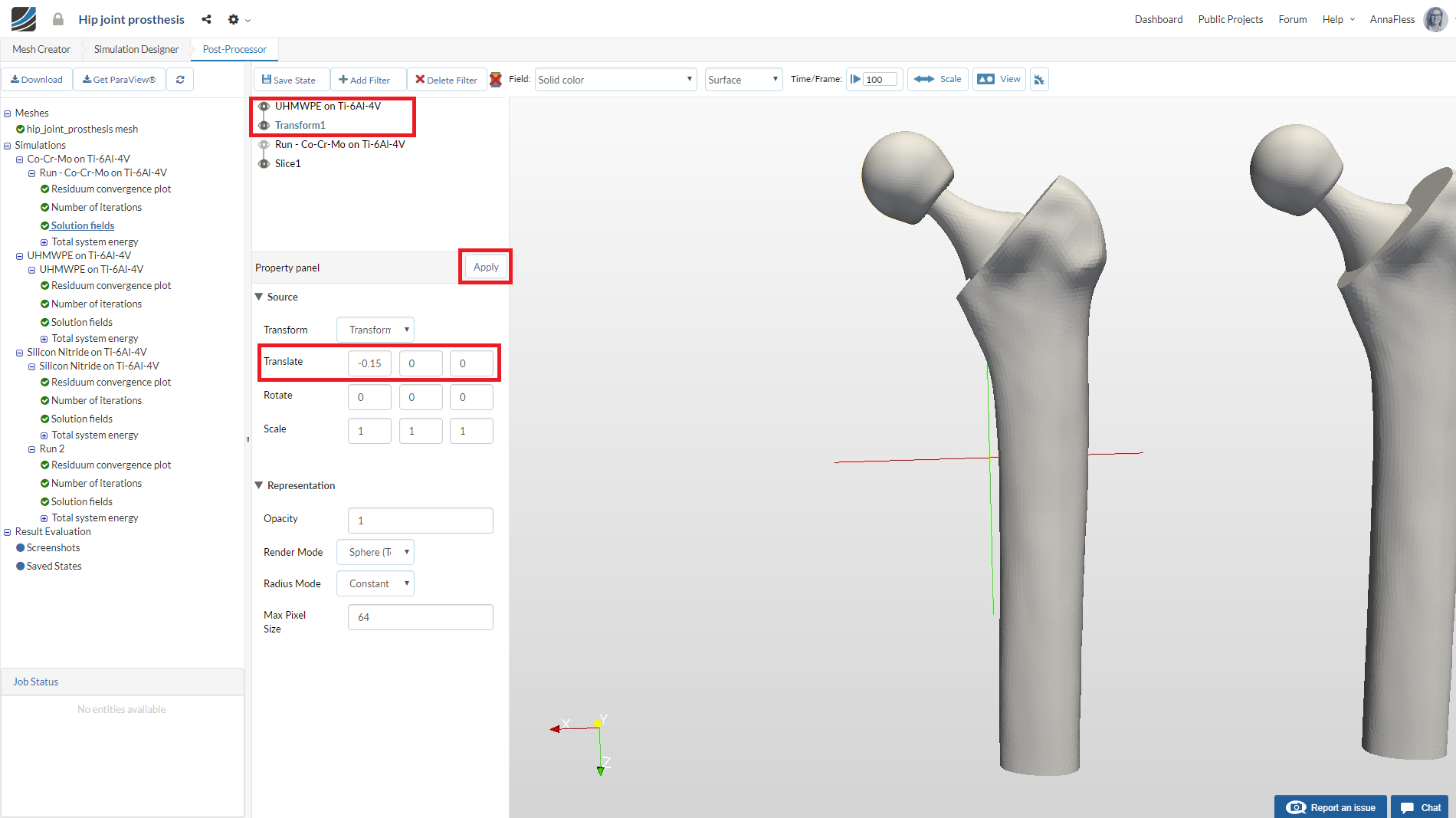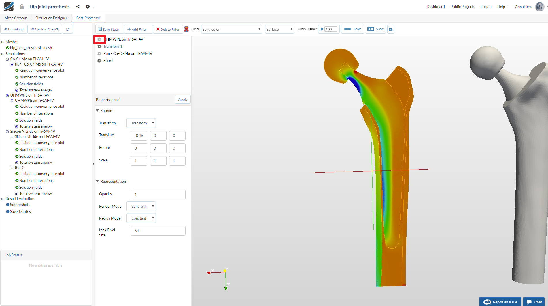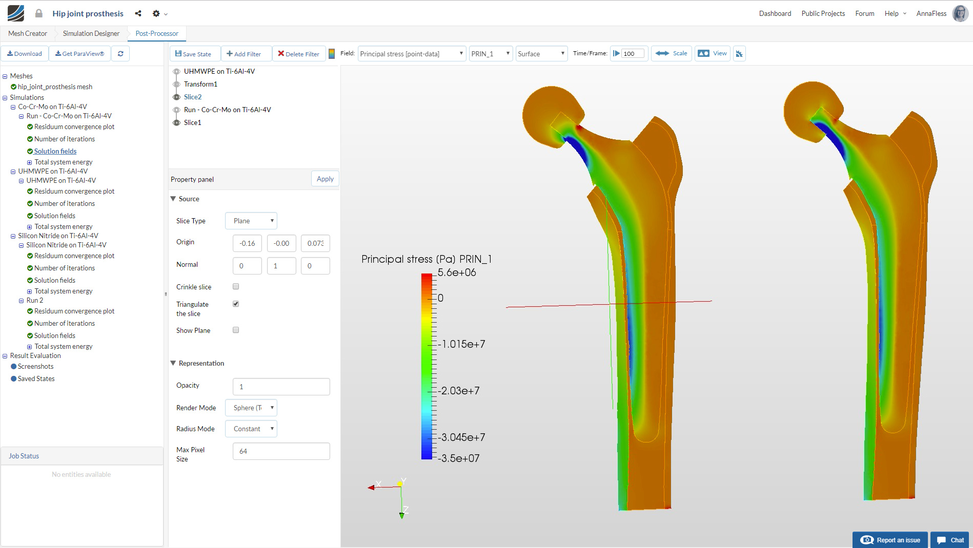 In order to view the stresses in the bone, we will add a slice filter. Click on Run-Co-Cr-Mo on Ti-6Al-4V.