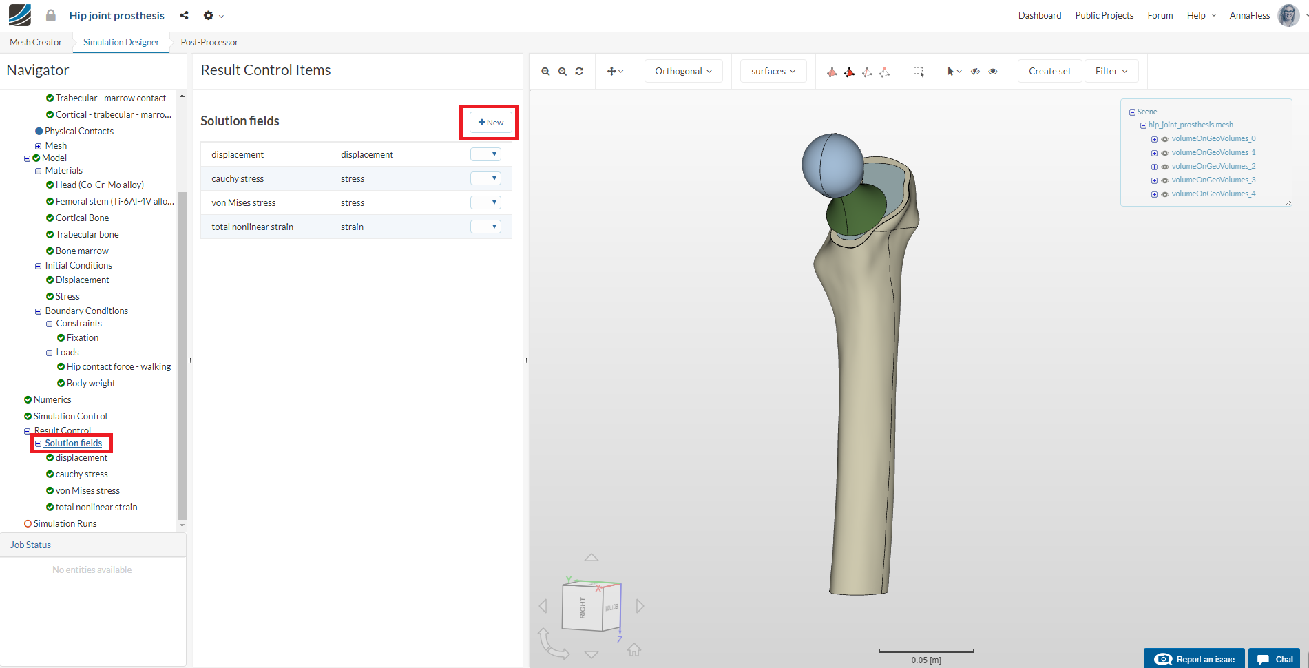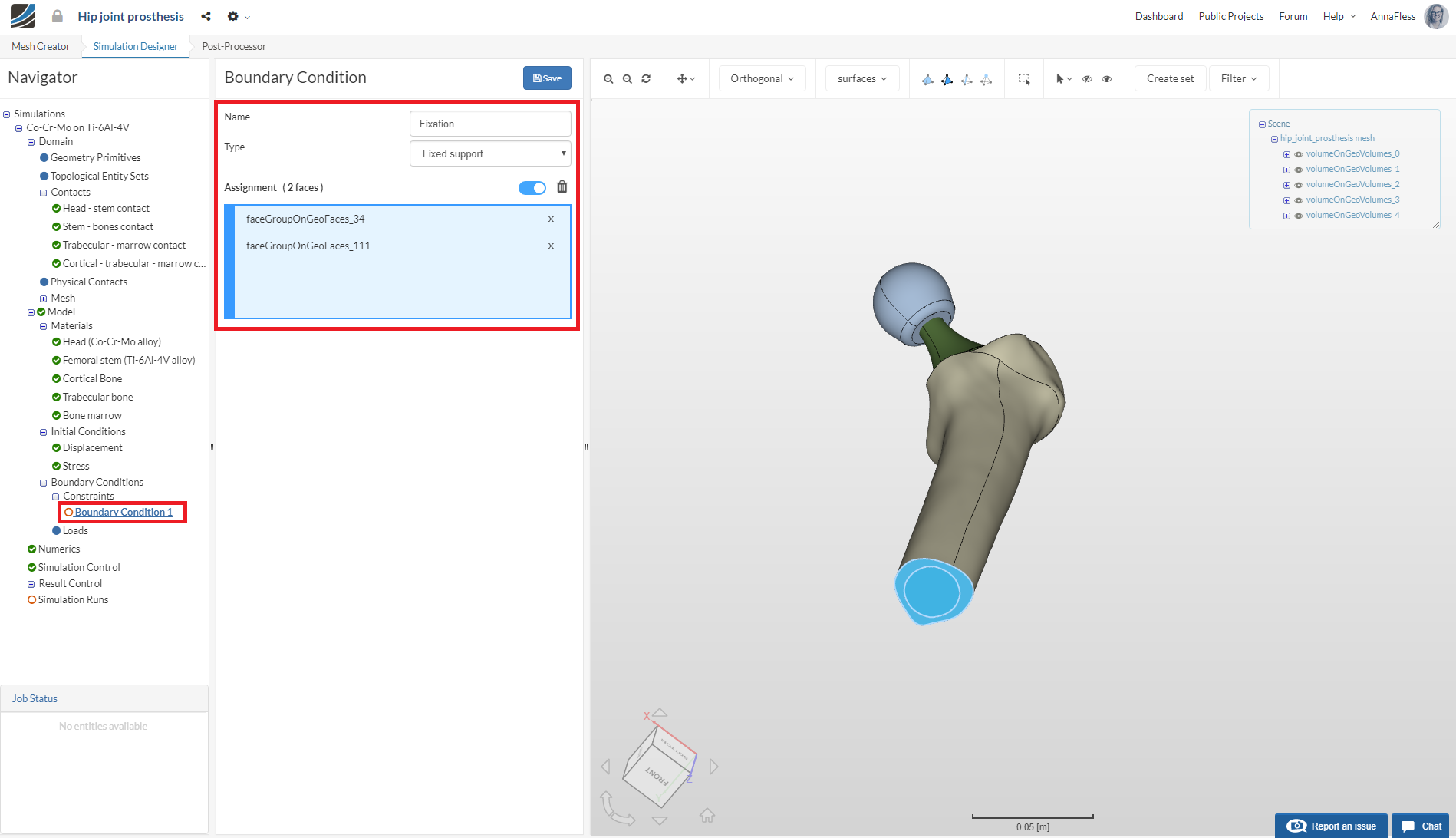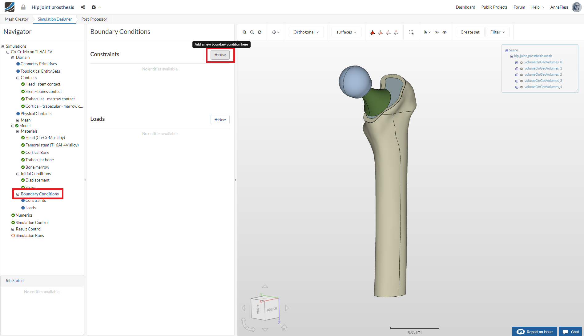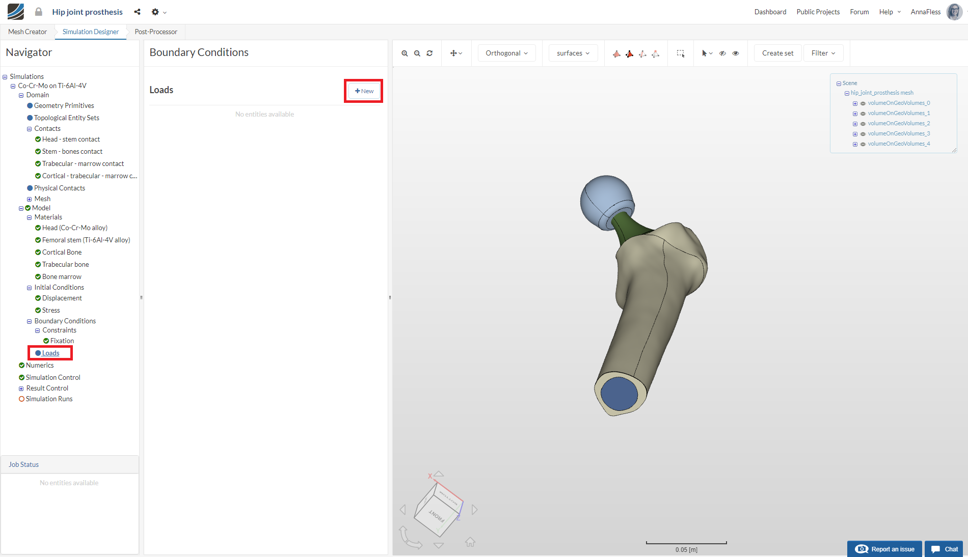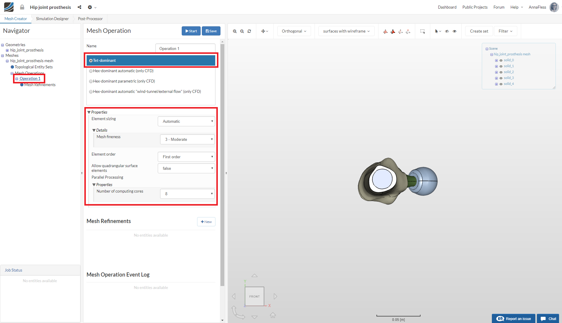 In the Mesh Creator tab, click on the geometry hip_joint_prosthesis