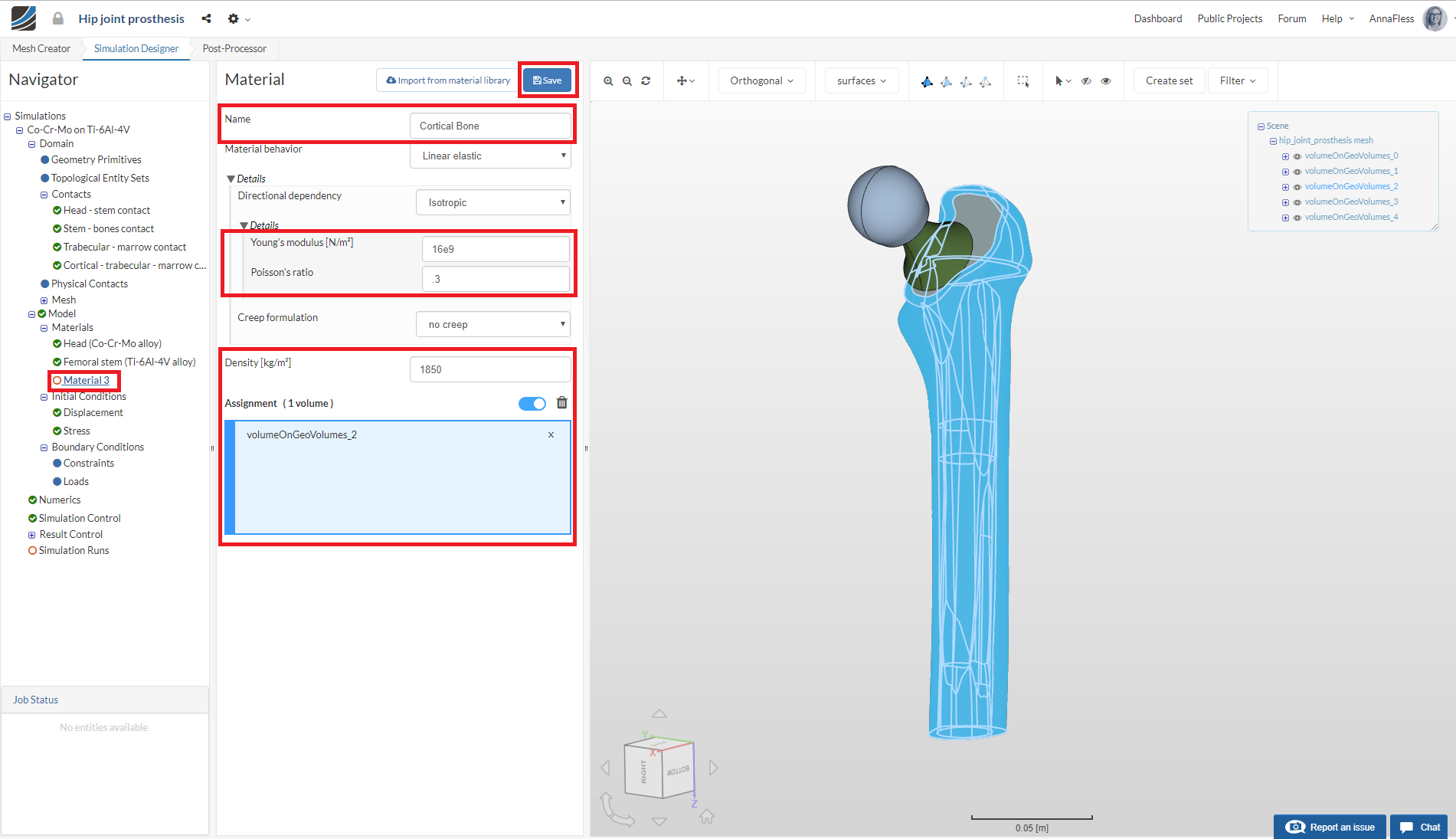 Now that the contacts are set up, we will define the material definition for all of our volumes. The material definition for the bones and the hip joint are taken from reference [1].