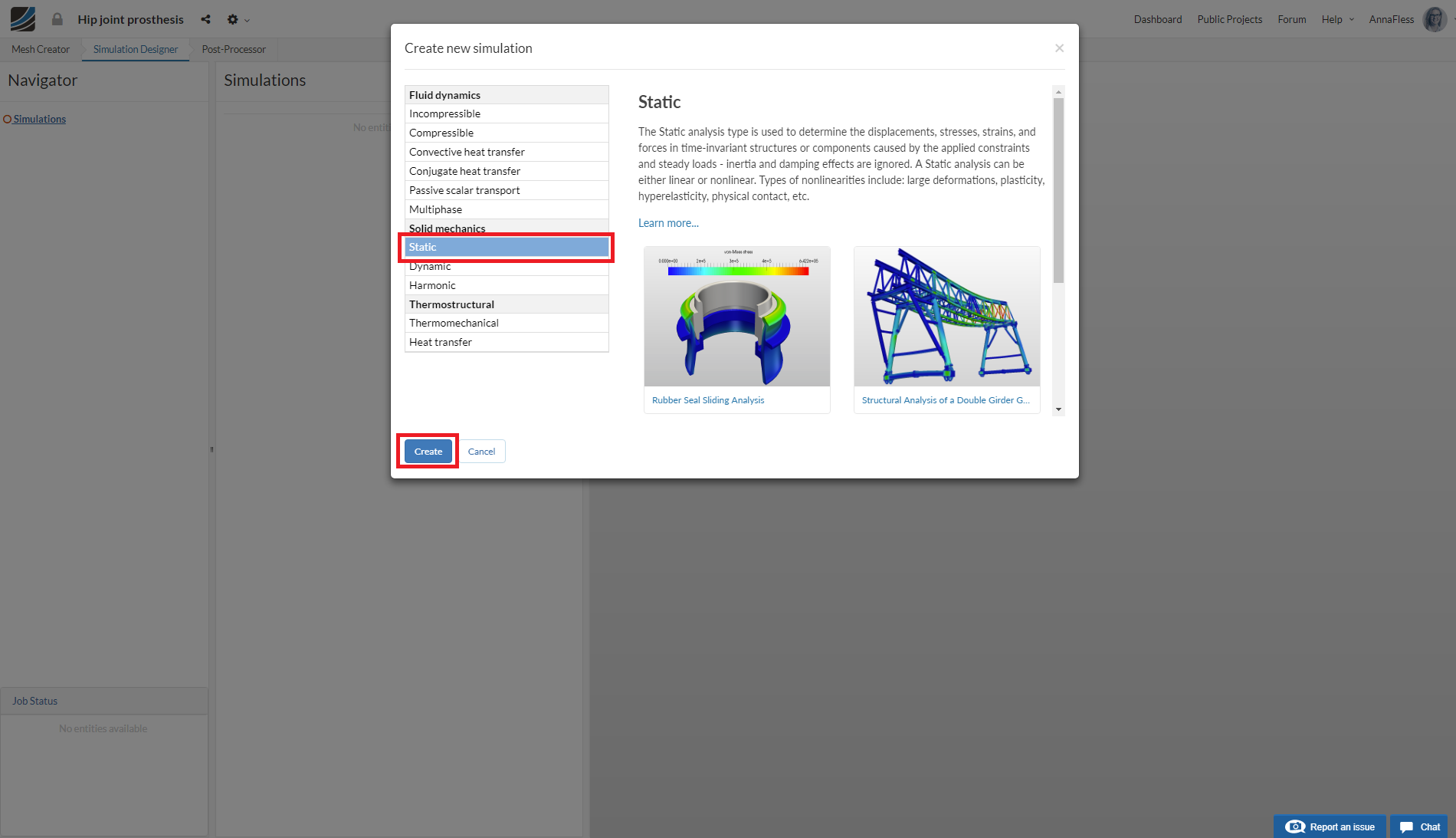 Since we want to evaluate the displacements, stresses, and strains on the hip prosthesis and femur, select the analysis type Static under Solid mechanics and then click create.