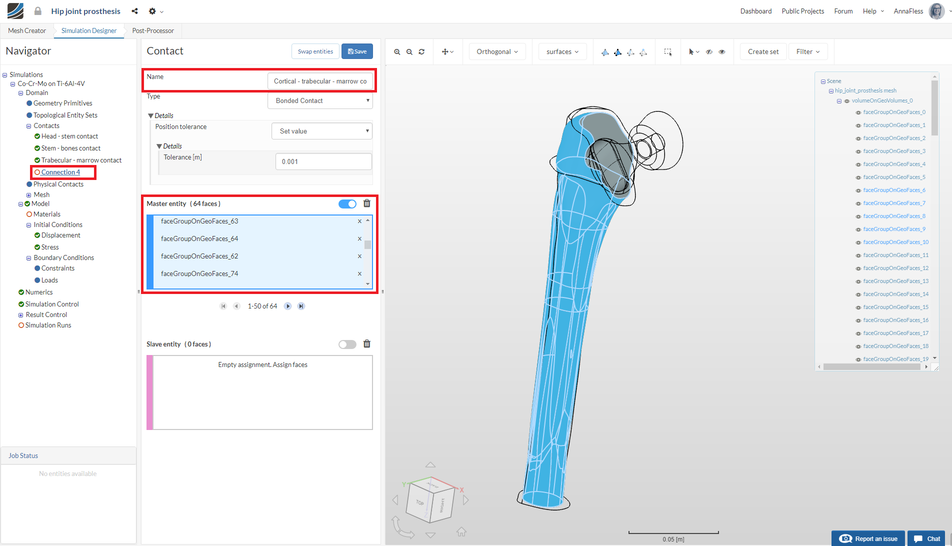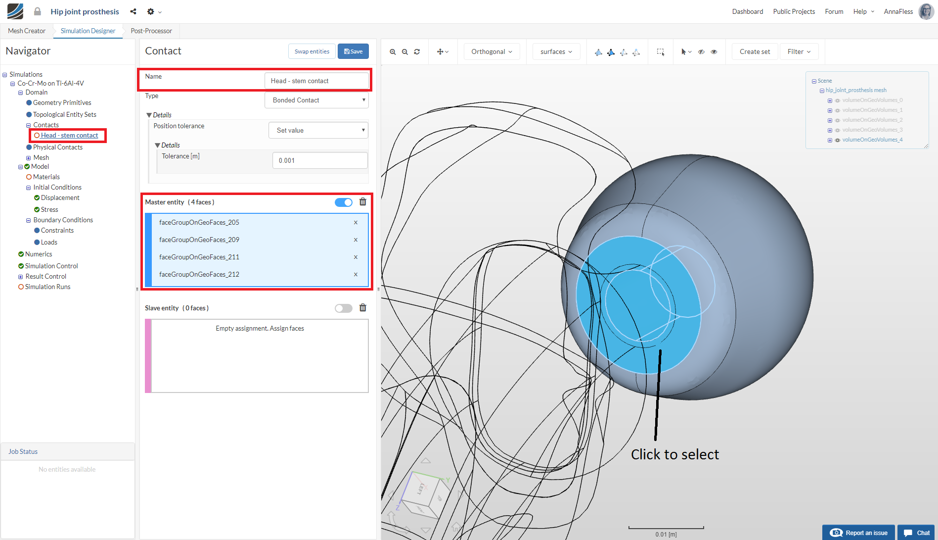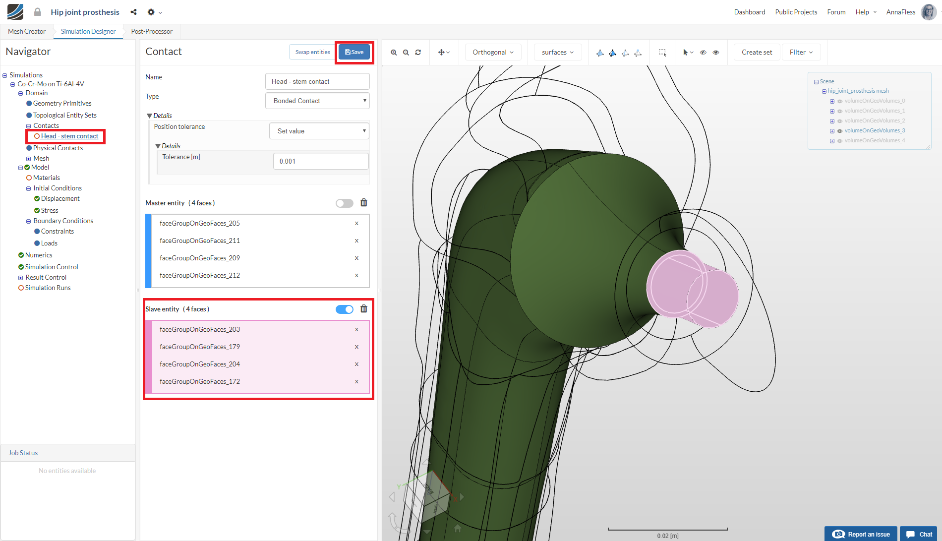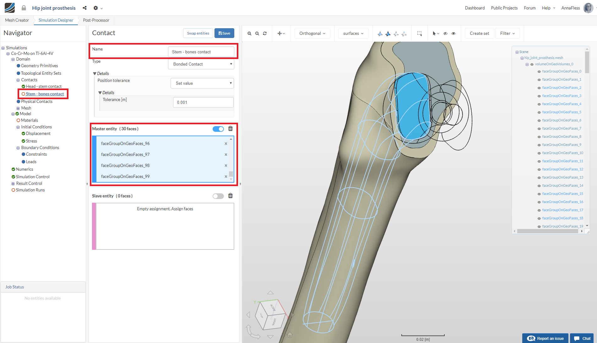 Then follow the same procedure for selecting the surfaces of the stem that are in contact with the head and assign these faces to the Slave entity.