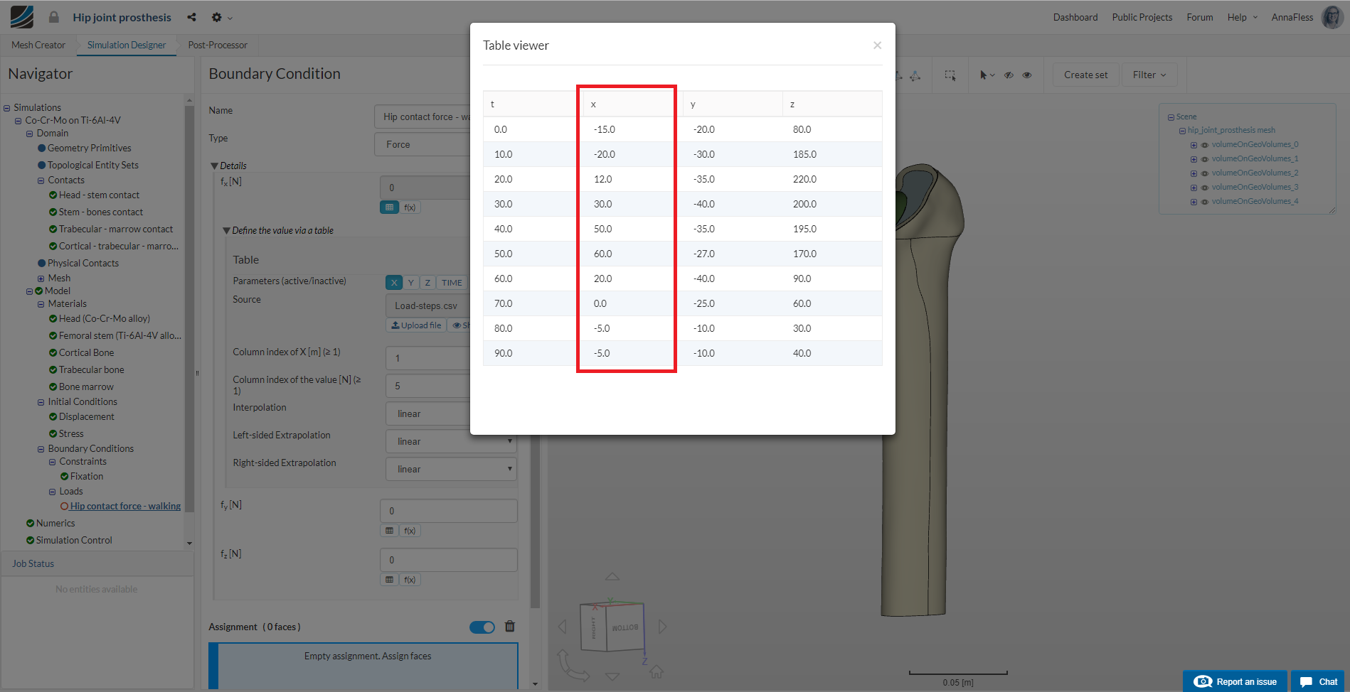 The hip joint head, which transfers the load from the upper body to the lower body is loaded with a variable force over 100 iterations (Force 1). See the graph below: