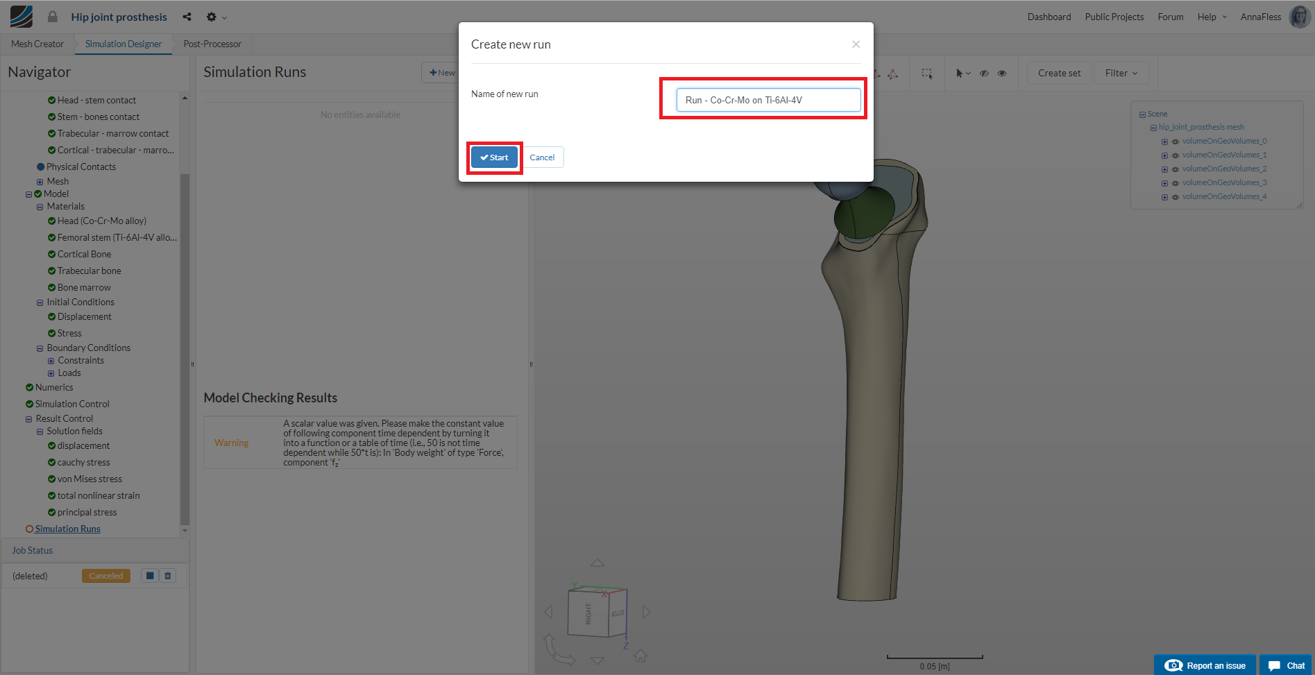 Next create a new simulation run, rename it to UHMWPE on Ti-6Al-4V (optional) and click Start to start the run.