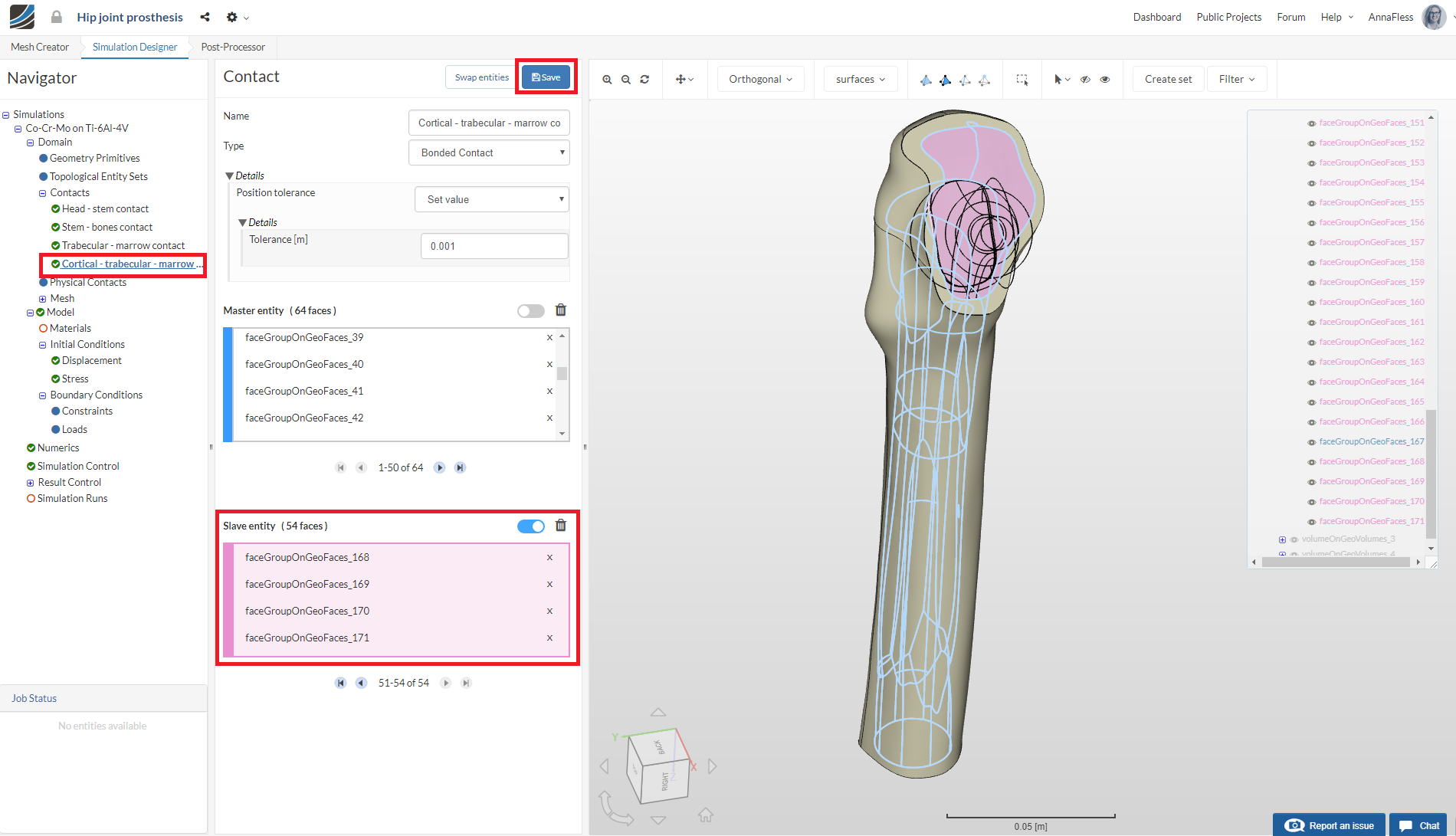 Create a New Contact called Cortical - trabecular - marrow contact. Hide all volumes except volumeOnGeoVolumes_0 and volumeOnGeoVolumes_1. Select all of the outer faces and assign them as the Master entity.