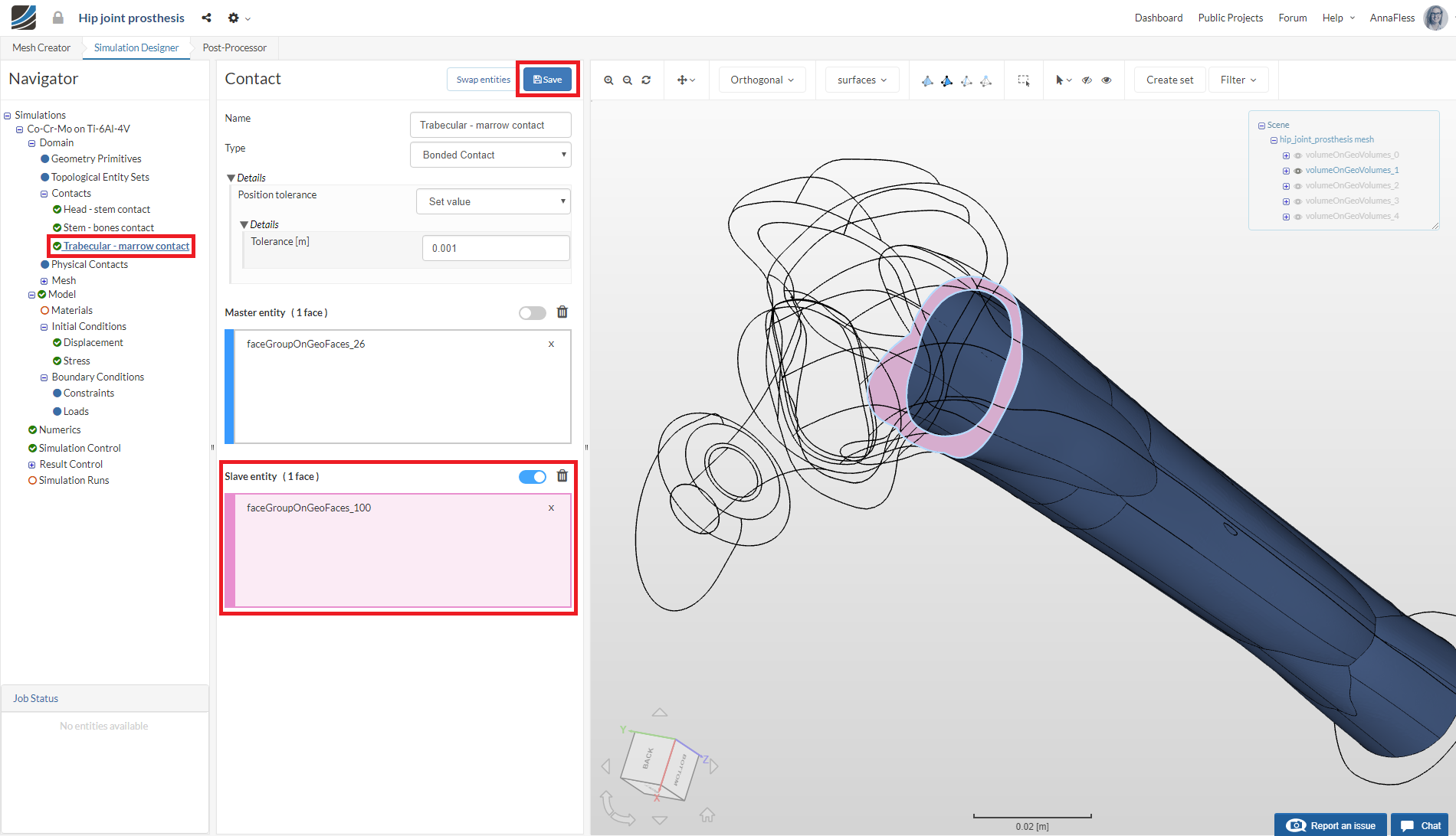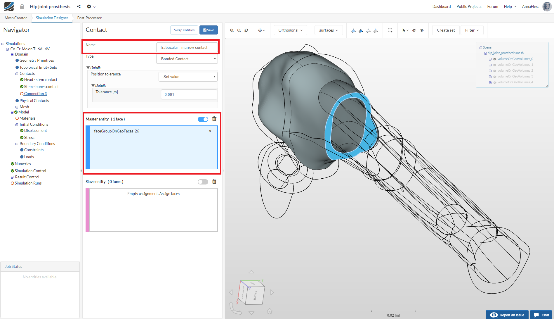 Create a New Contact called Trabecular - marrow. Hide all volumes except volumeOnGeoVolumes_0. Select the lower face and assign it as the Master entity.