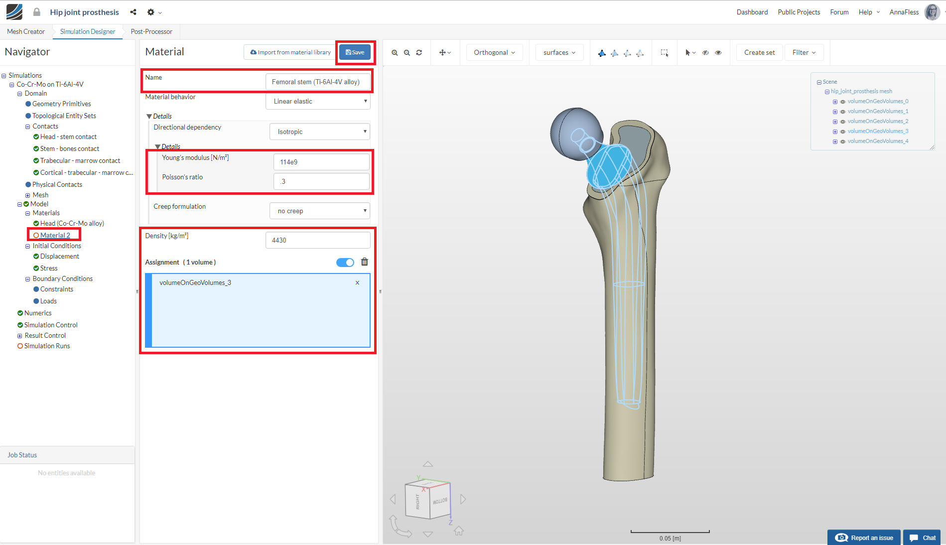 Proceed with the same steps as above to create a new material. Rename the newly created material to Femoral stem (Ti-6Al-4V alloy) (optional).