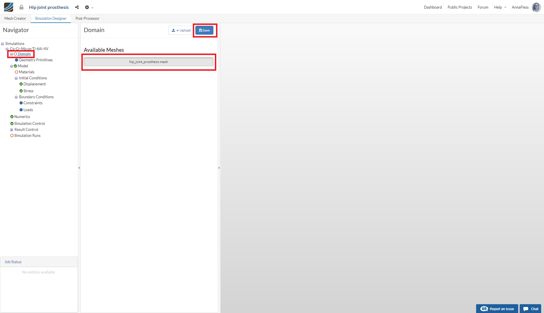 Click the Domain item in the Navigator and select the mesh that you just created. Click Save. The mesh will then automatically load in the viewer.