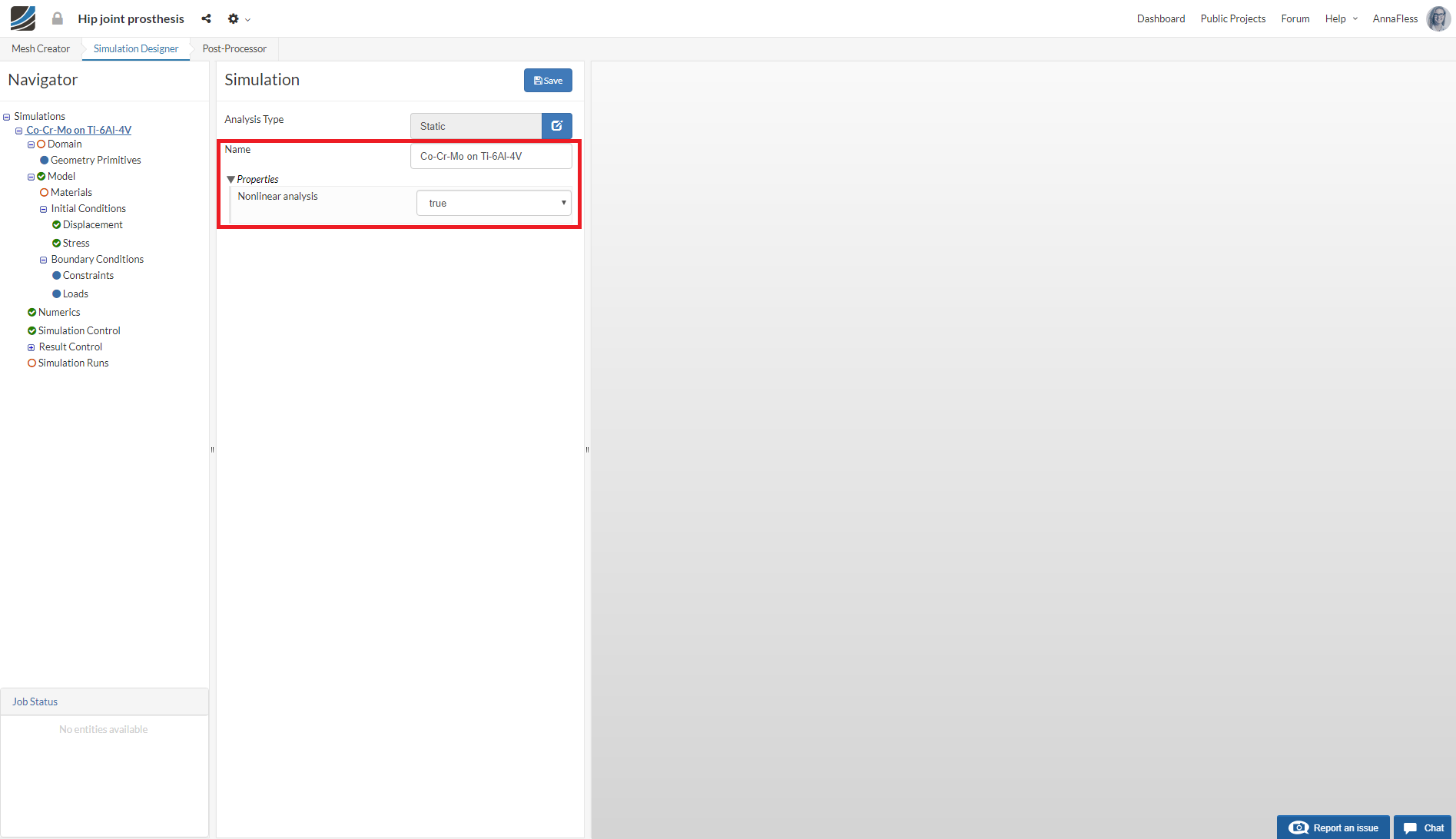 Give the project a name (optional) Co-Cr-Mo on Ti-6Al-4V and set the Nonlinear analysis option to true and click Save.