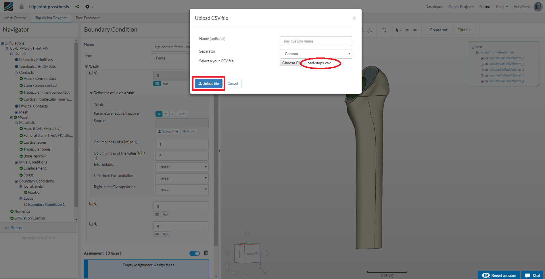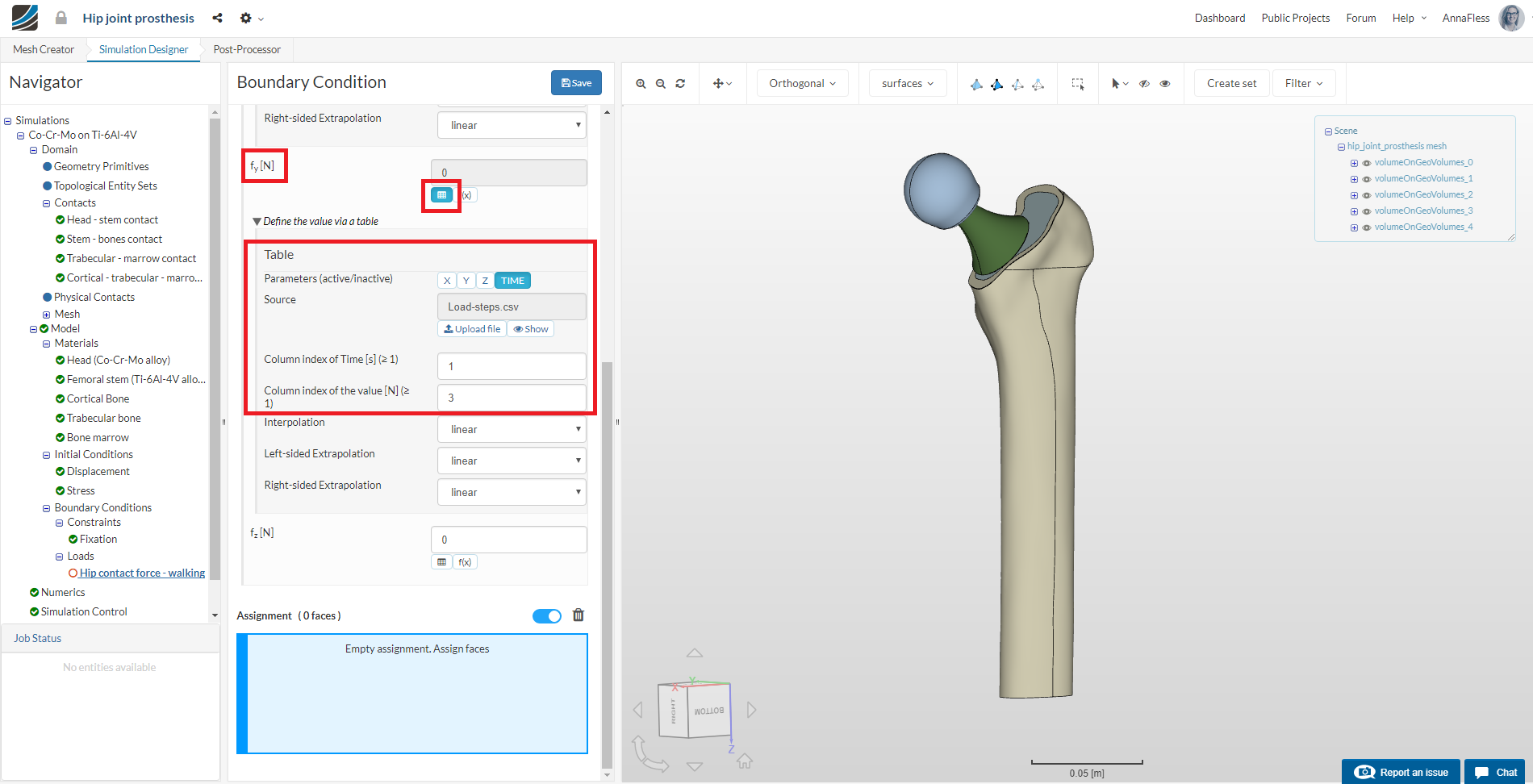 Next we will define our first load boundary condition on the femur hip joint head for the hip contact forces when a person is walking.