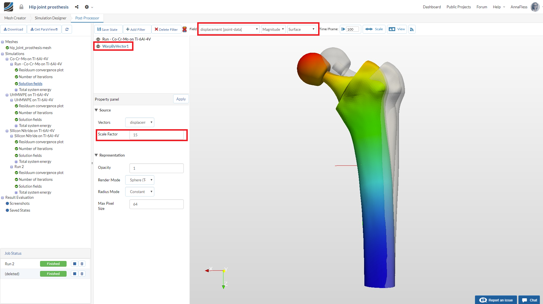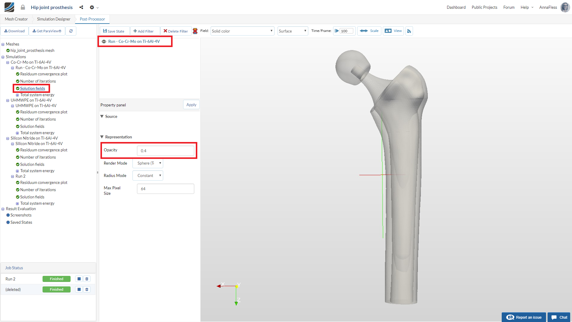 Select the Solution fields of the simulation run you want to view results. In this case it is Run-Co-Cr-Mo on Ti-6Al-4V.