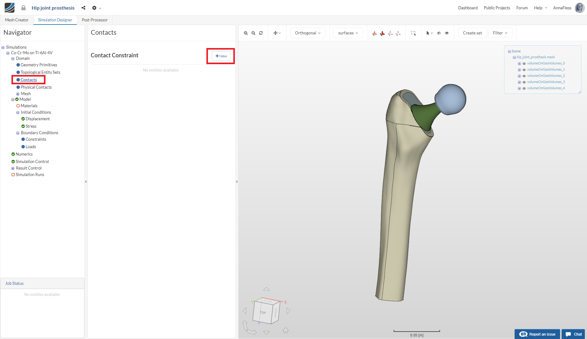 Due to different material definitions for the bone and hip joint, we have to have a geometry that contains multiple volumes. These need to be bonded together so that the solver knows that they are connected. We will proceed with defining the bonded contacts between all of the solids.