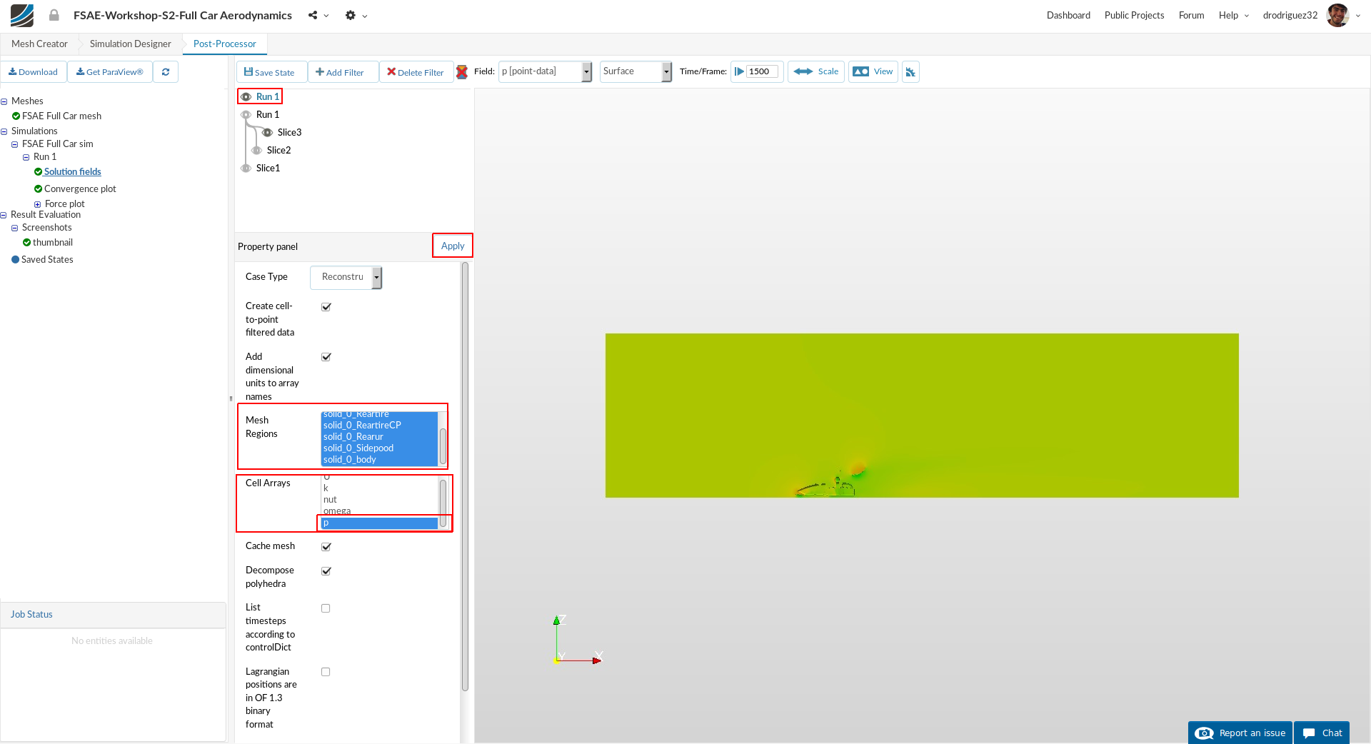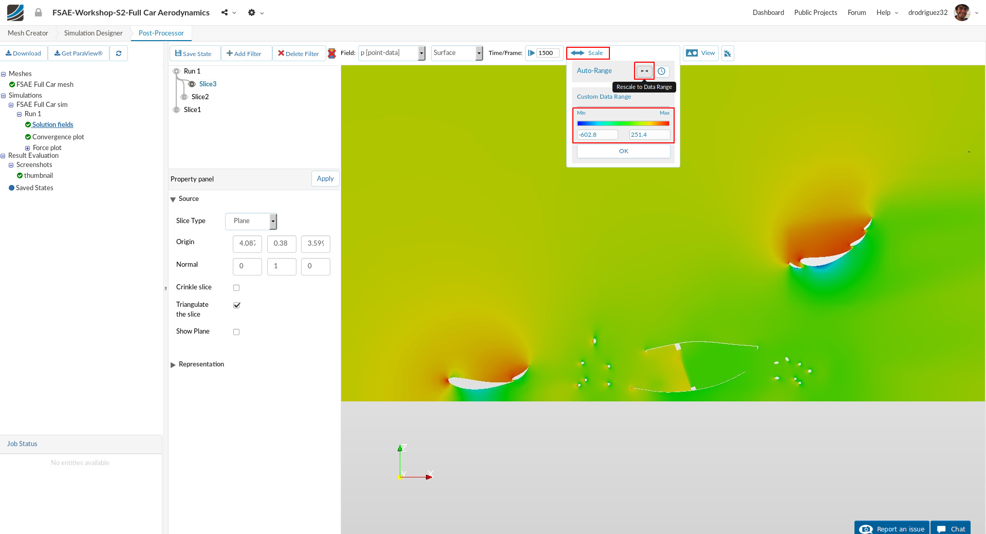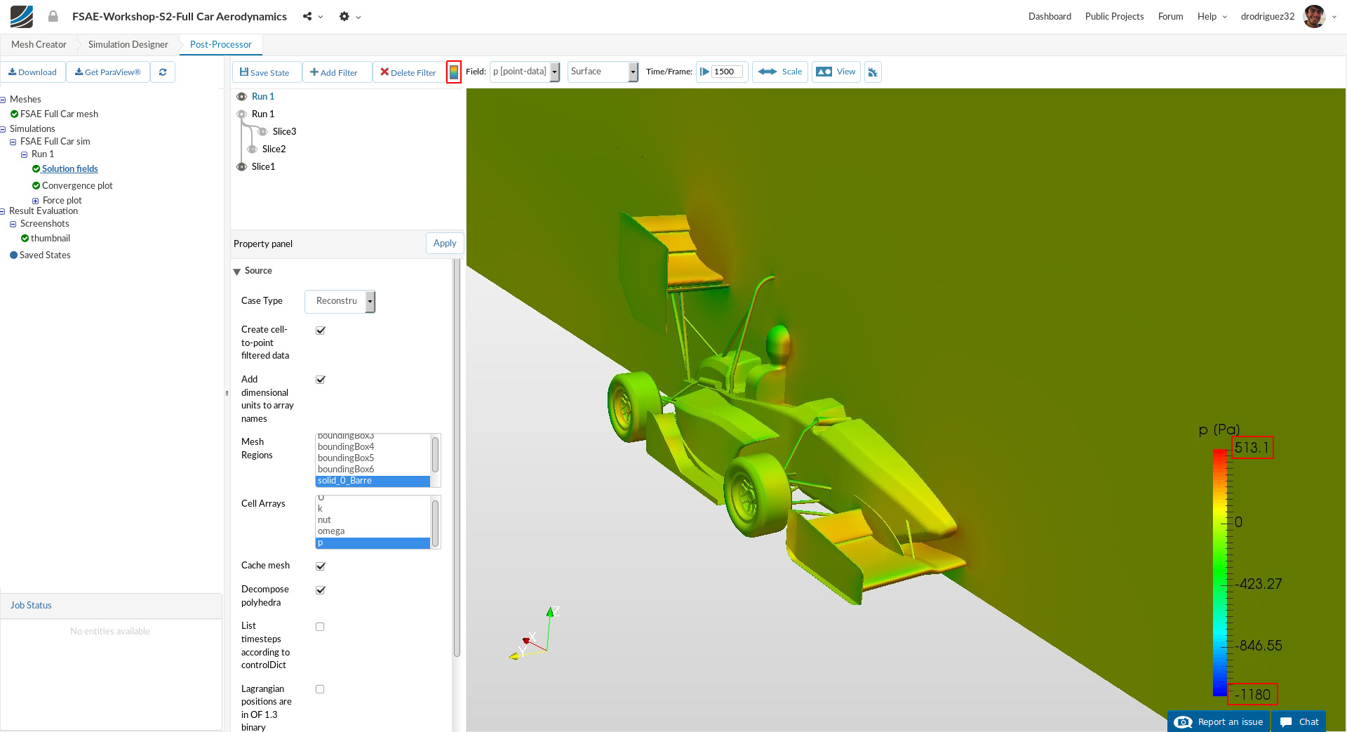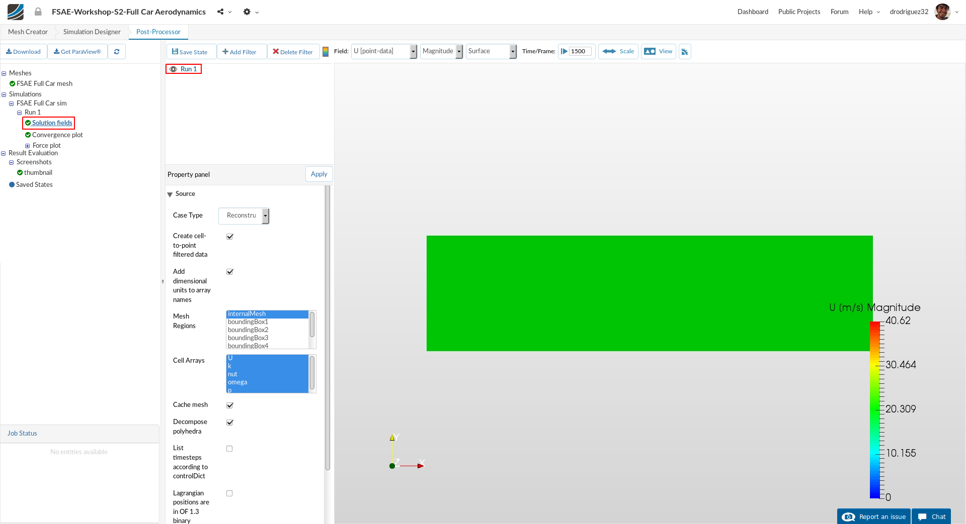 Once in Post-Processor, click on Solution fields under FSAE Full Car sim in order to load the results in viewer. Due to fine mesh it can take up to 5 minutes to load the results in to the viewer.
