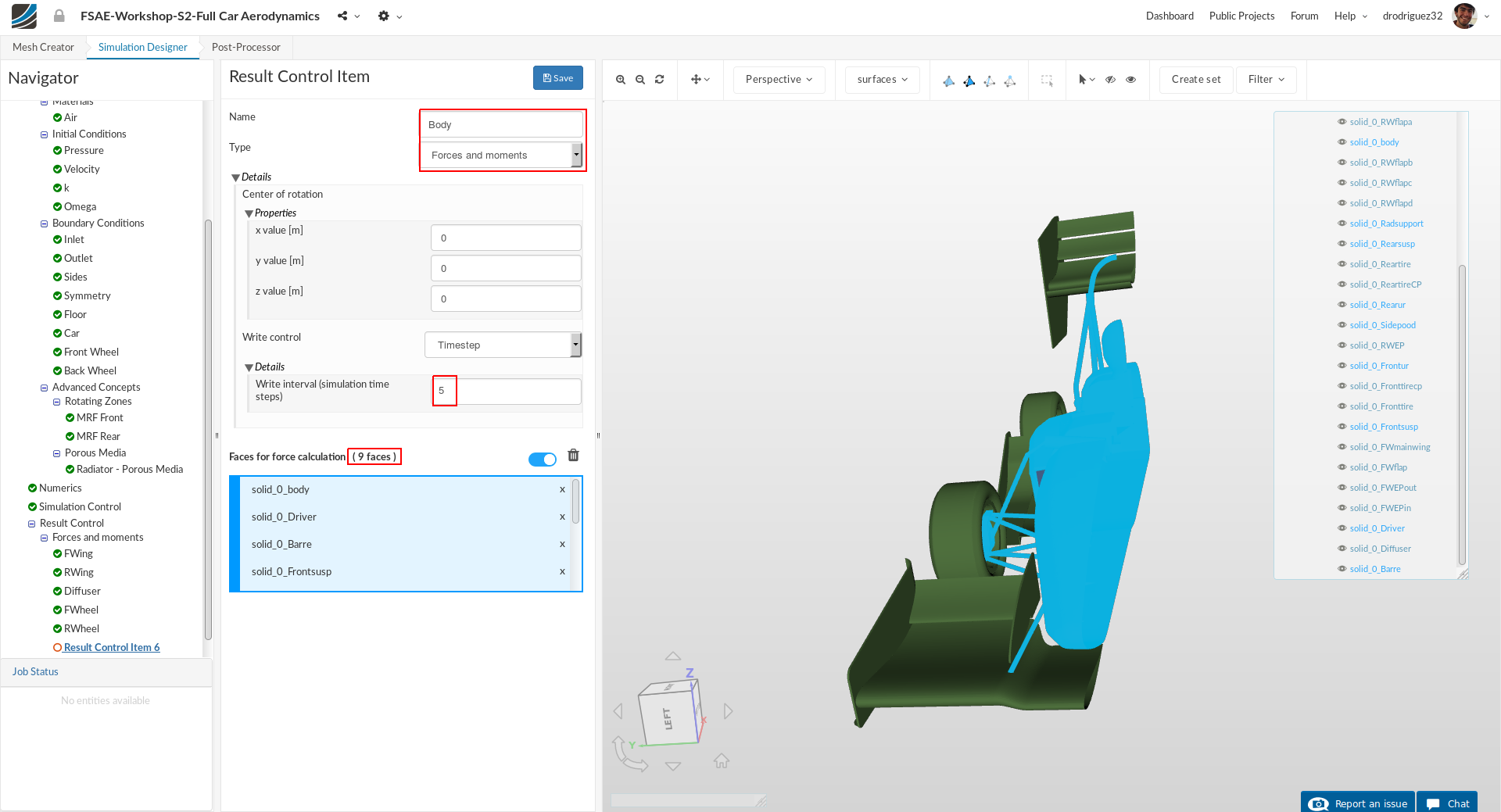 Make sure you have the 9 surfaces selected. They should be blue in the viewer, the names should appear in the highlighted area under Faces for force calculation and they should also be highlighted in the navigator on the right. Click Save to register your changes.