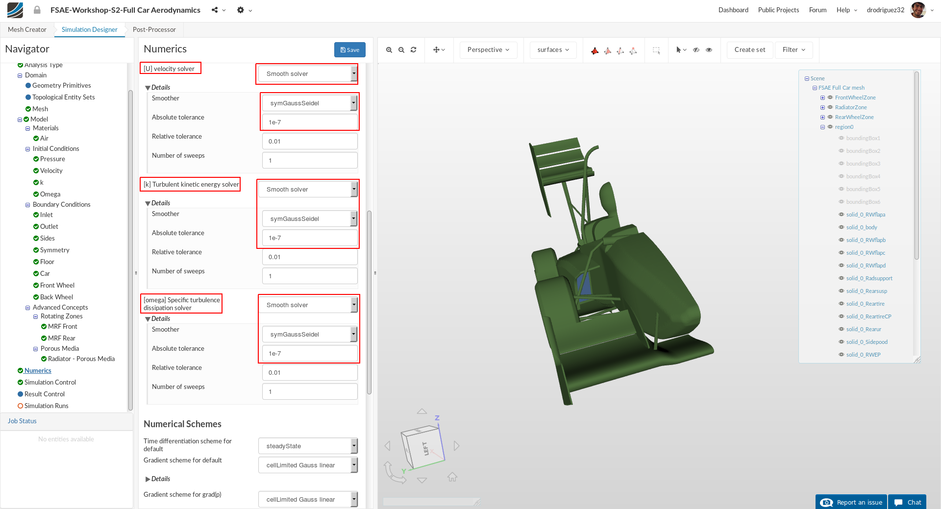 [U] velocity solver to Smooth solver, Smoother to symGaussSeidel and Absolute tolerance to 1e-7. Do the same for [k] Turbulent kinetic energy solver and [omega] Specific turbulence dissipation solver.
