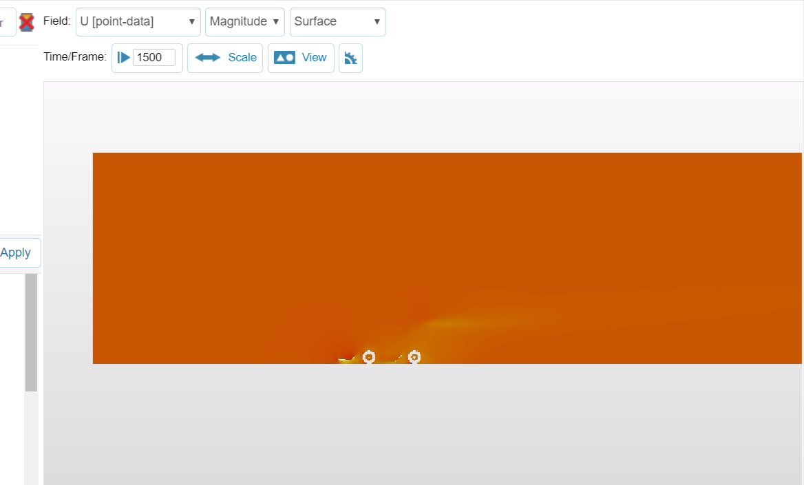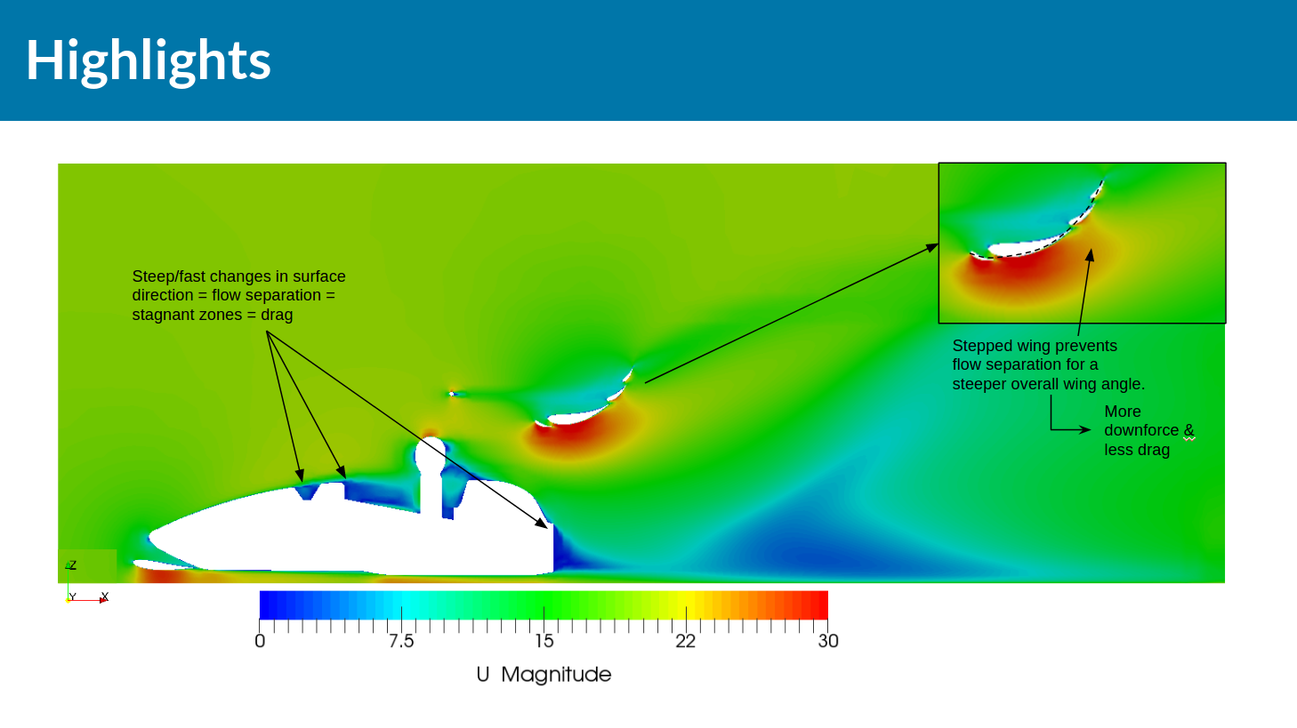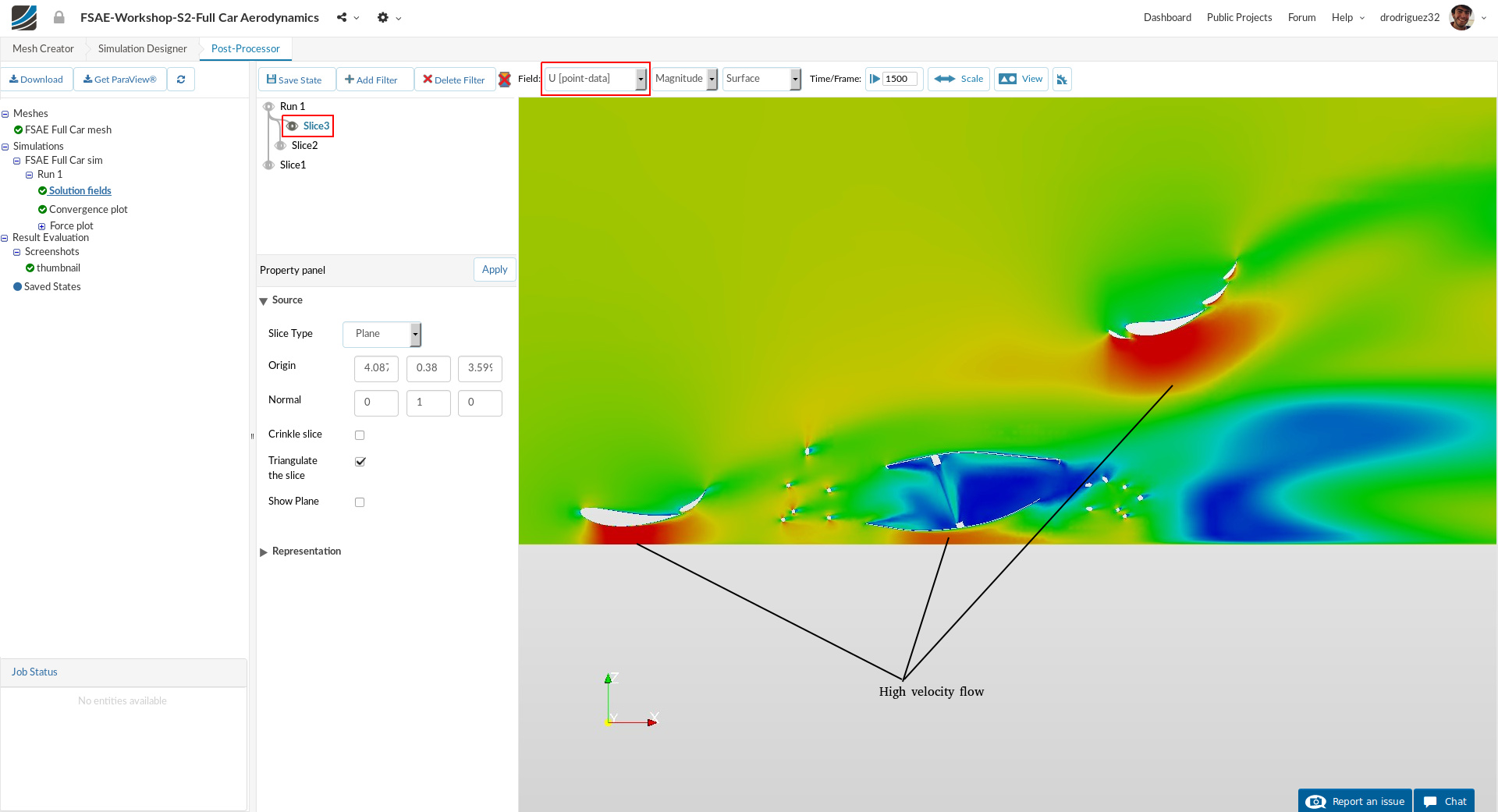 Another interesting field to visualize is the velocity. For the previous slice, change the field to U [point-data]. Note the high velocity flow below the wings - this is how they generate downforce. Also, notice that the flow becomes almost stagnant when it enters the sidepod and hits the radiator.