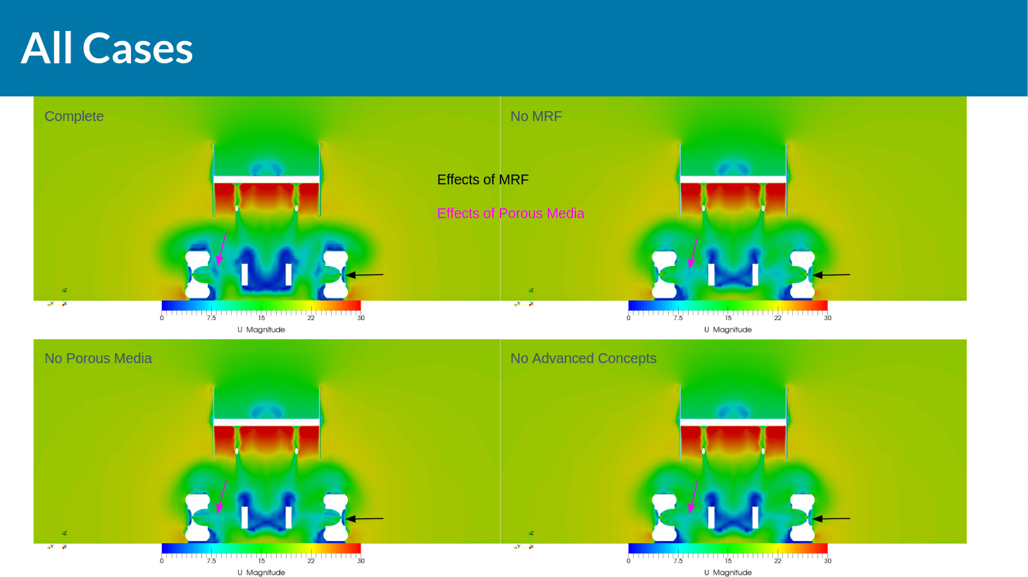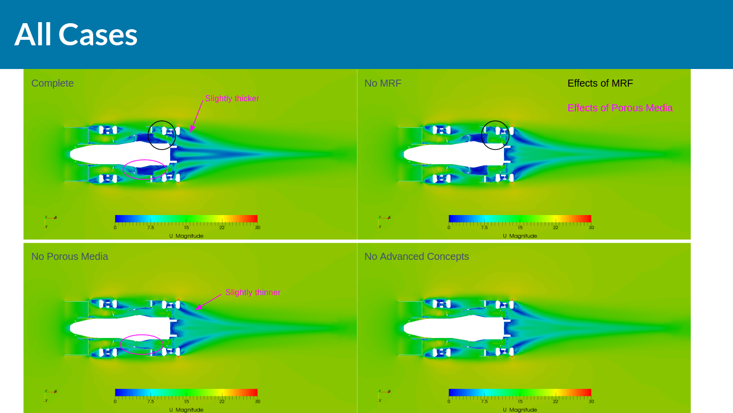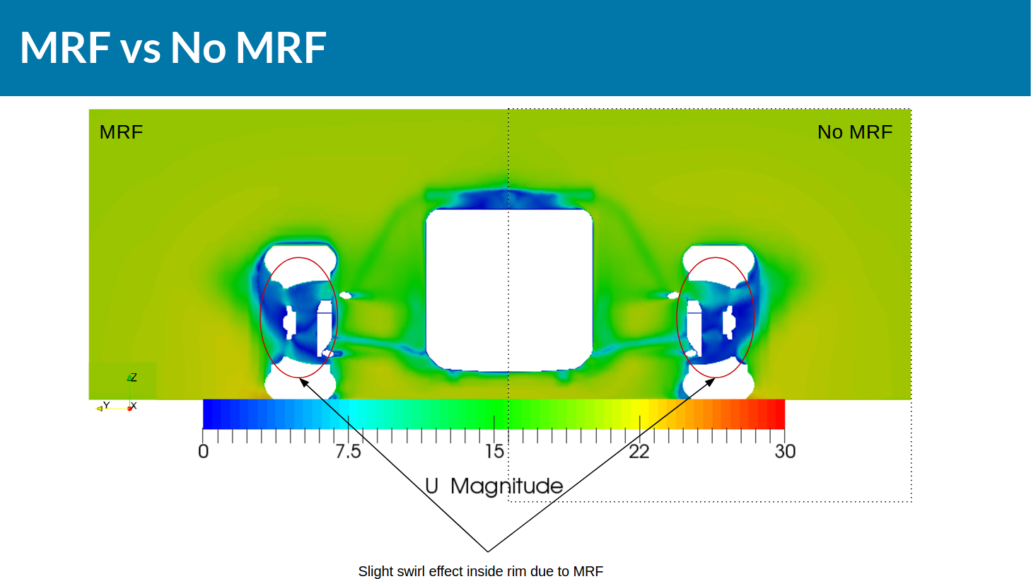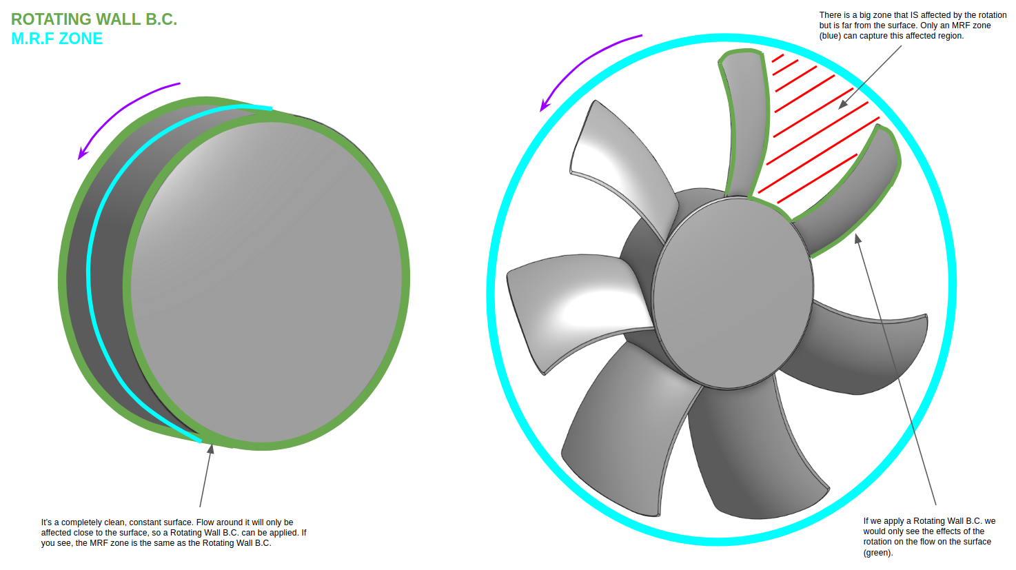 You have just added a Rotating Wall Boundary Condition in part 1, and now you will add the MRF zones. The difference between a rotating wall boundary condition and the MRF zone comes down mainly to the geometry. Here’s how it works: the rotating wall allows us to correctly simulate the effects of the rotational solid on the fluid close to the surface of the solid. This works well when you have a simple geometry like a cylinder (essentially these tires). We could apply an MRF zone to the tires too, but this would be computationally more expensive and not necessary because the tire is only affecting the flow close to its surface. On the other hand, the spokes of the wheel rim not only affect the flow close to their surface but around a much bigger zone, and this zone is the one we define as an MRF zone. Refer to the following image for a visual explanation.