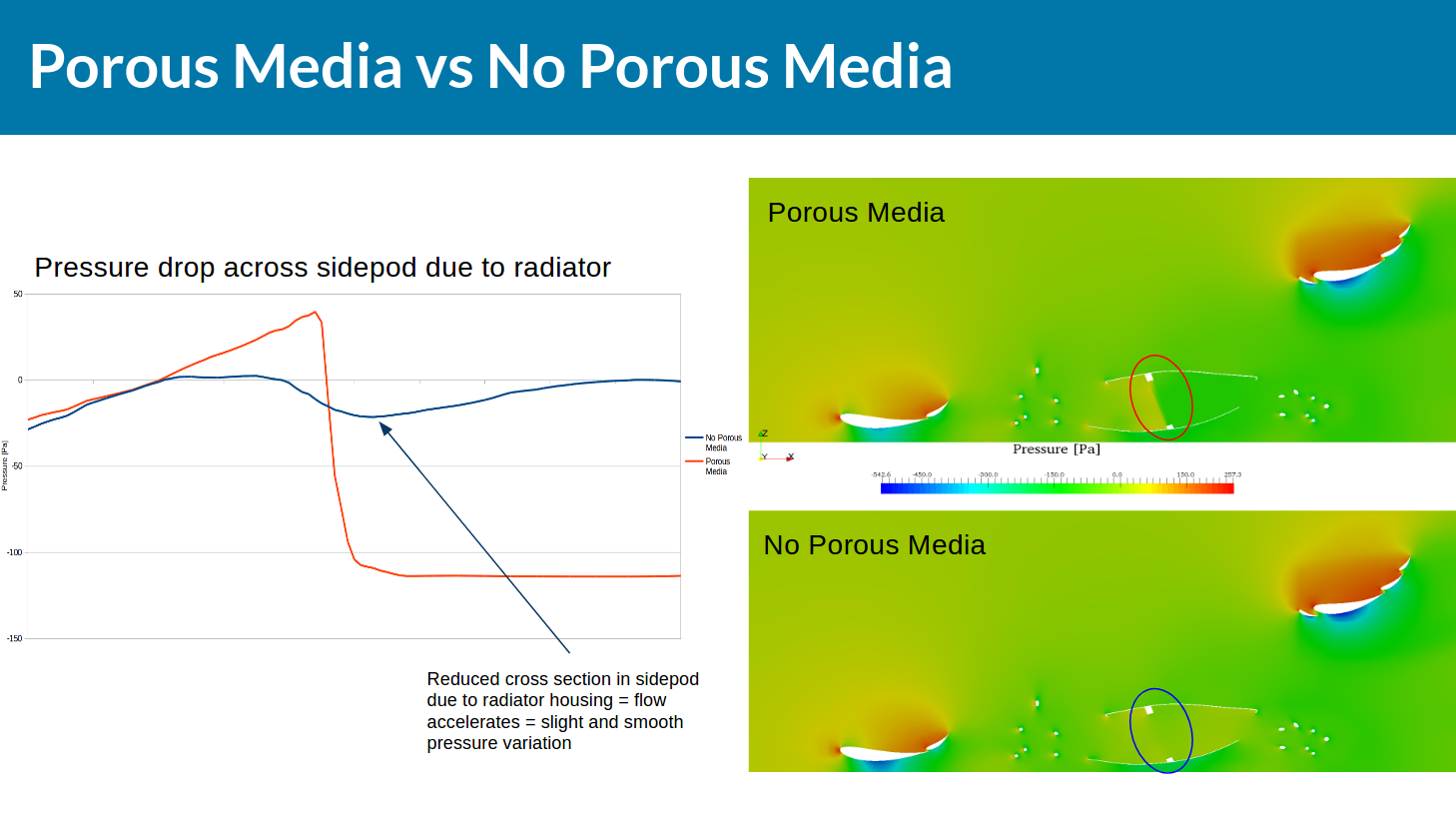 Notice how there is a pressure buildup in front of the radiator and a sudden pressure drop across it.