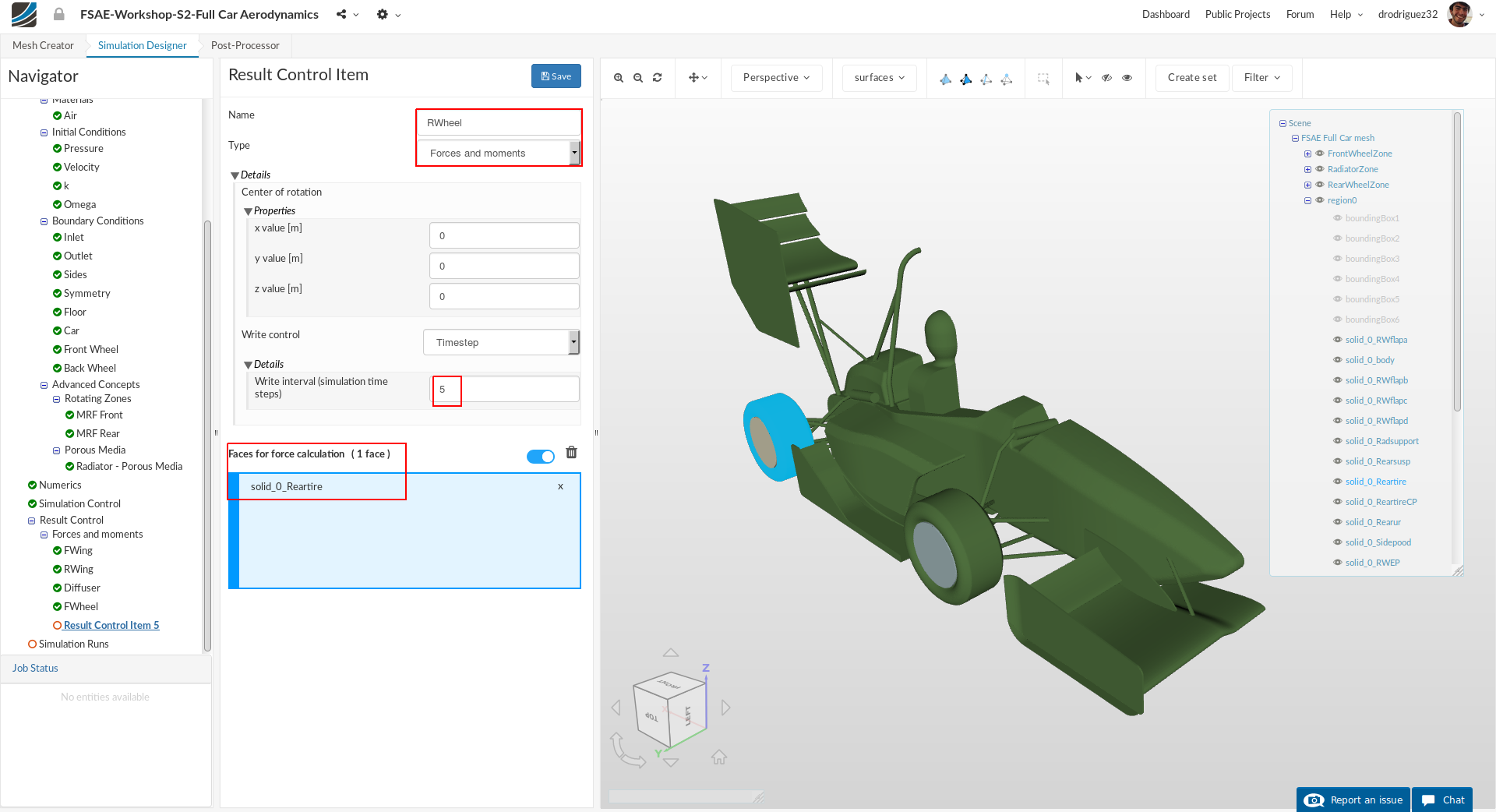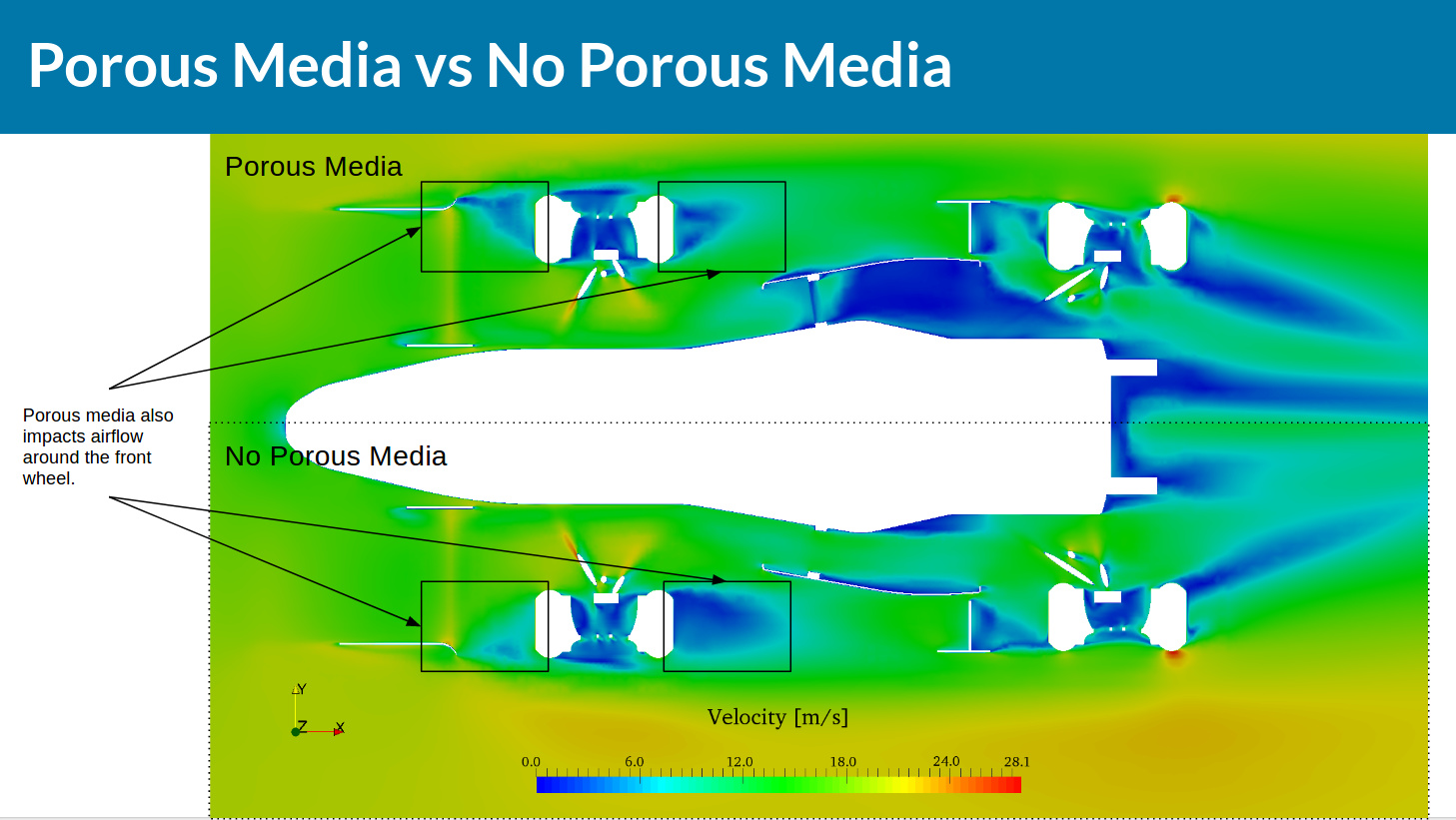 Your homework is to investigate the Full car model FSAE Full Car with a radiator using the porous media approach, rotating wheels using the rotating wheel boundary condition, and rotation of the car rims using Multi Reference Frame (MRF). For this case, the front wing flap angle of 0 degrees will be considered and the velocity of the car will be set at a constant 20 m/s.