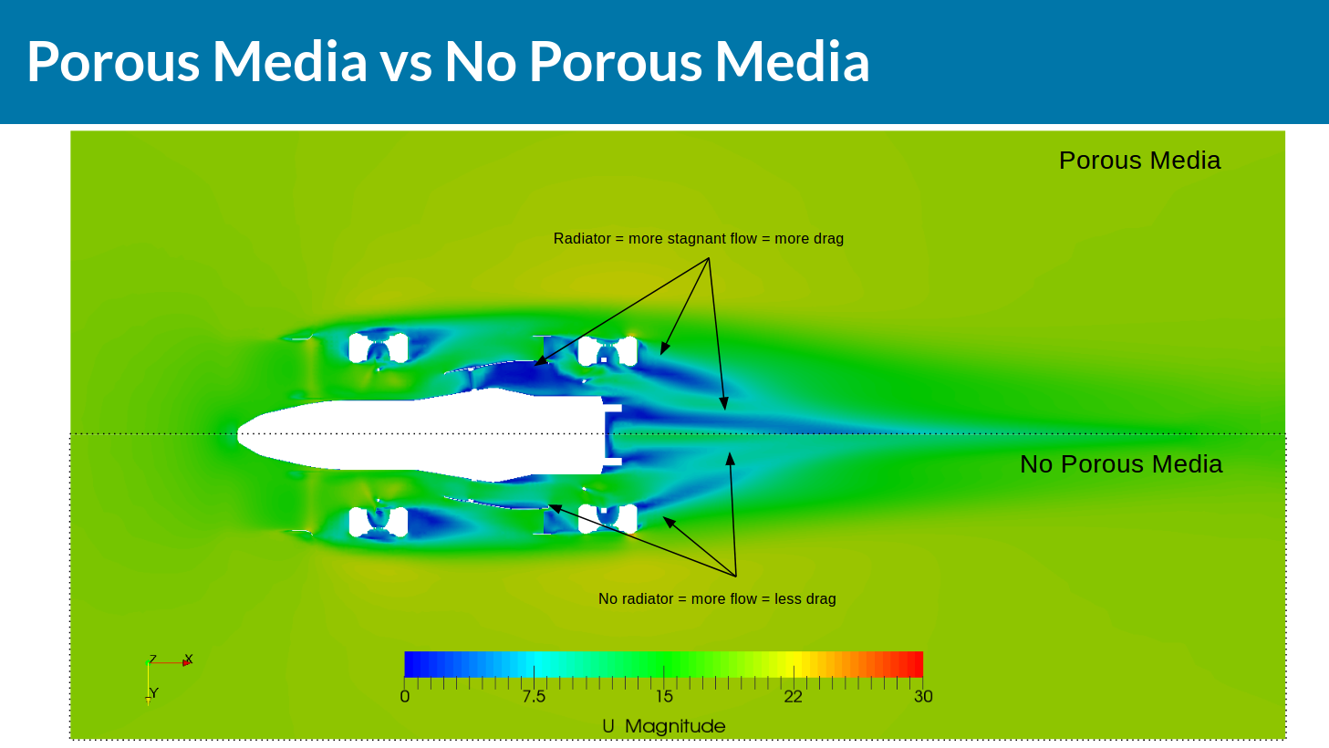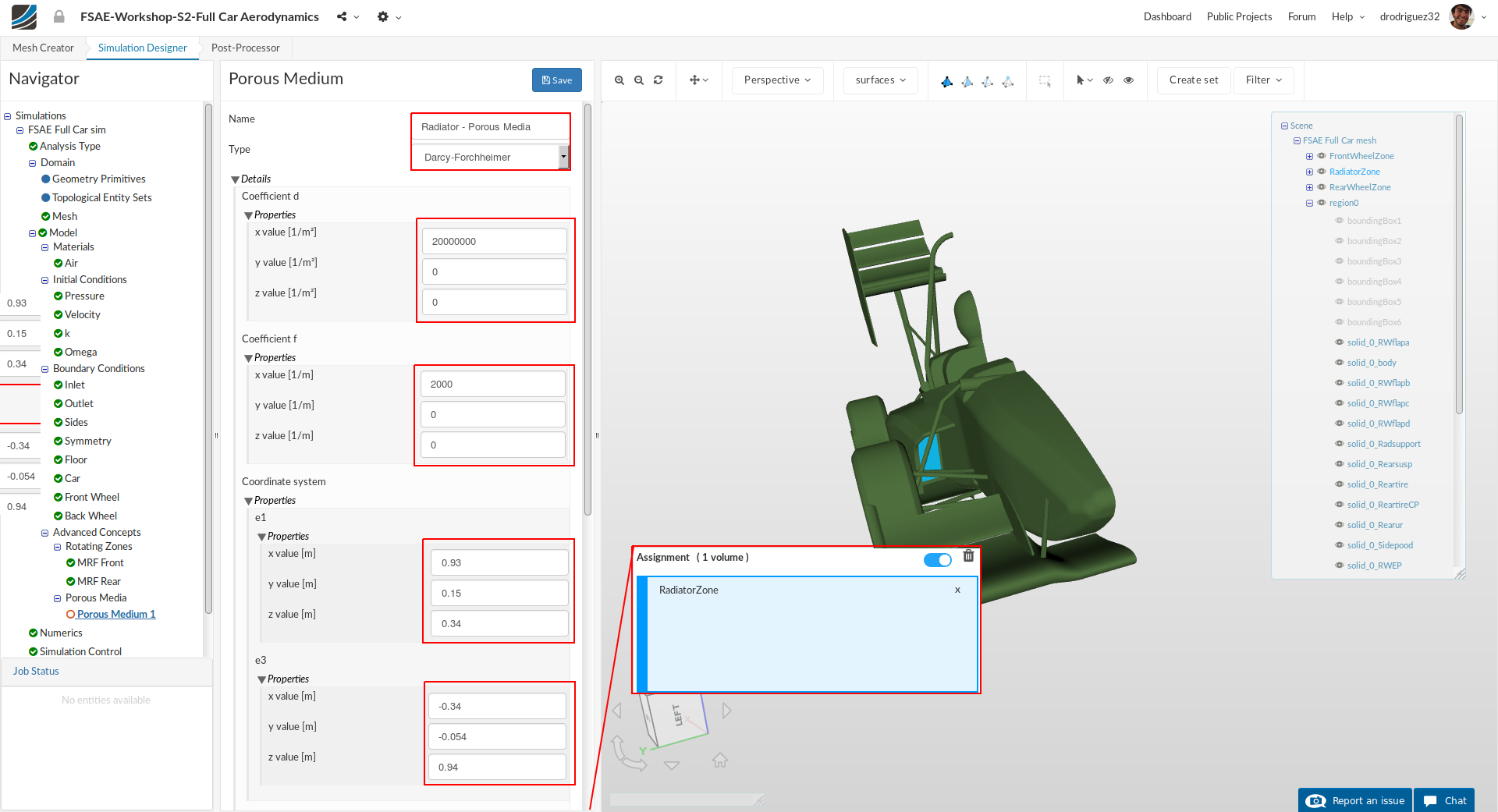 In this section we will define the radiator via porous media. In the real world there are many things that are very complex for a simulation to be viable. A perfect example of this is turbulence, and as we already explained, instead of having an ridiculously fine mesh, we apply some mathematical models that predict the turbulence with enough accuracy to make engineering decisions. Porous objects present a similar challenge for simulations: imagine how refined a mesh would have to be in order to capture all the details (tiny holes and structures) of a sponge, an air filter, or in this case a radiator. So to solve this, we use the porous media approach. This approach adds some terms to the equations that are being solved for the cells in that zone so that the behavior of the porous solid can be predicted correctly. These equations take into account the porosity and the mean particle diameter to observe the effects on the flow and the inertial effects when you have high velocity flow. To read more about this go to Porous Media in the SimScale documentation.
