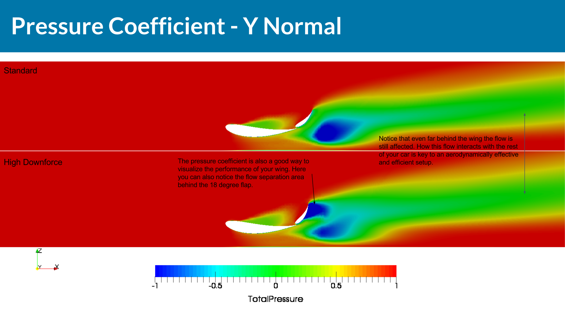 a. The pressure coefficient we know as Cp is in fact a way to normalize pressure, not visualize energy. The Cp represents the relative pressures in a flow field, so it will be close to zero in the freestream, negative when air is accelerating under a wing or the car, and positive near the stagnation points.