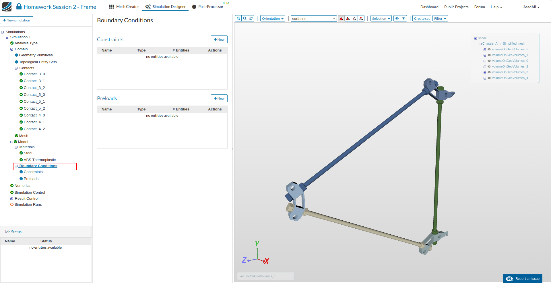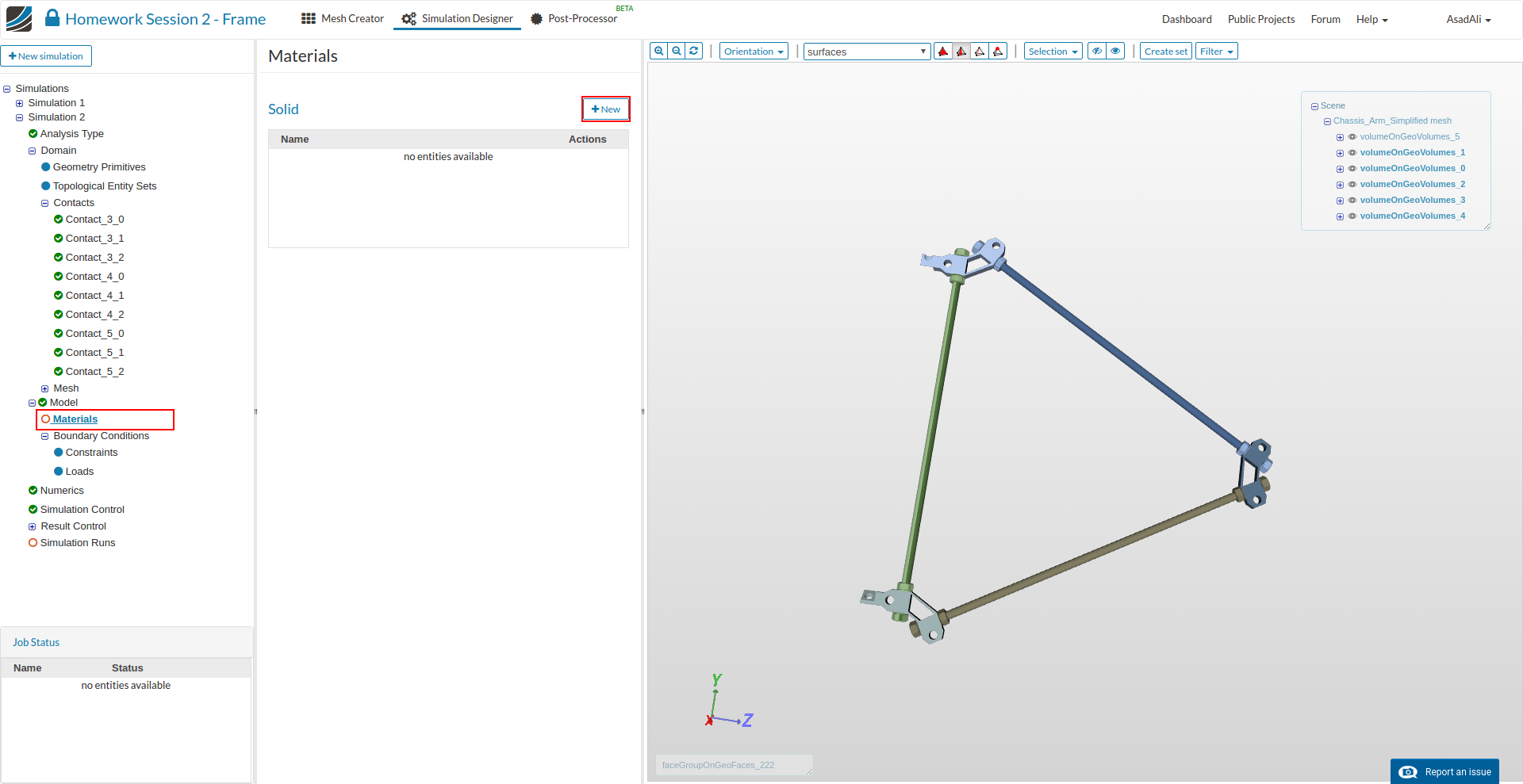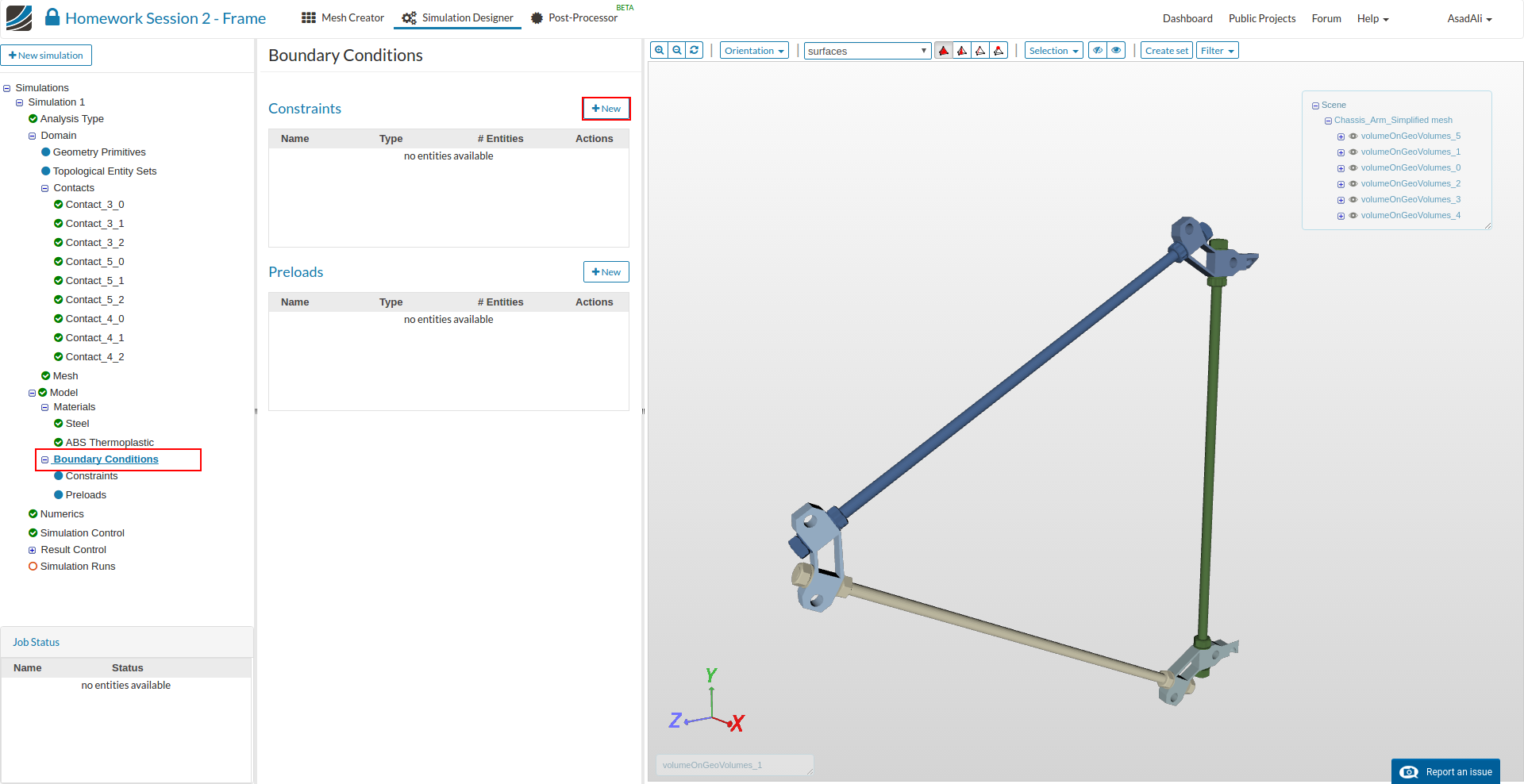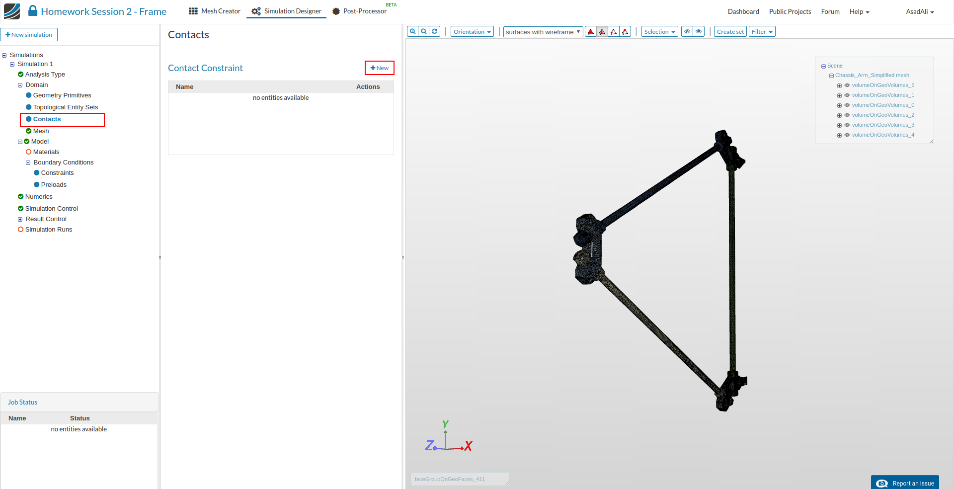 Since we are simulating an assembly of parts it is necessary to define the interactions withing the assembly and with its environment. We will therefore define this so called Contacts, which are also covering the physical interaction between parts. This topic was also covered very detailed during the last webinar. You can find the section about contacts here